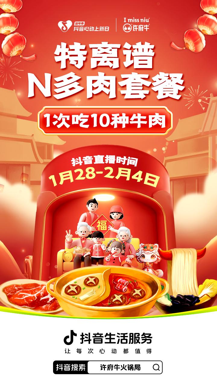 新年之初,牛肉火鍋知名品牌許府牛攜手「抖音心動(dòng)上新日」,共同探索新年聚餐場(chǎng)景新可能,于1月22日至2月4日期間,隆重推出“許府牛新春賀喜,牛氣沖天”主題活動(dòng)?;顒?dòng)期間,品牌為大家特別奉上了特離譜N多肉套餐,抖音直播間僅107.9元即可暢享,且不限份數(shù)可無(wú)限回購(gòu)。春節(jié)不打烊,套餐新年也可用。在新年消費(fèi)高峰期,許府牛開(kāi)啟了官方大場(chǎng)直播、明星口播以及頭部團(tuán)購(gòu)達(dá)人PK直播等花式玩法,力度空前的四人套餐福利疊加驚喜霸王餐福袋設(shè)置,持續(xù)烘托著直播間火熱氛圍,引得網(wǎng)友們瘋狂喊話主播要求“上鏈接”。許府牛此次通過(guò)套餐品類創(chuàng)新、直播玩法創(chuàng)新、內(nèi)容場(chǎng)景創(chuàng)新等多重突破,成功將“新年上新,春節(jié)大促”的理念發(fā)揮到極致,進(jìn)而帶動(dòng)了生意銷量的高爆發(fā)、人群心智的深植入以及品牌形象的強(qiáng)刷新。