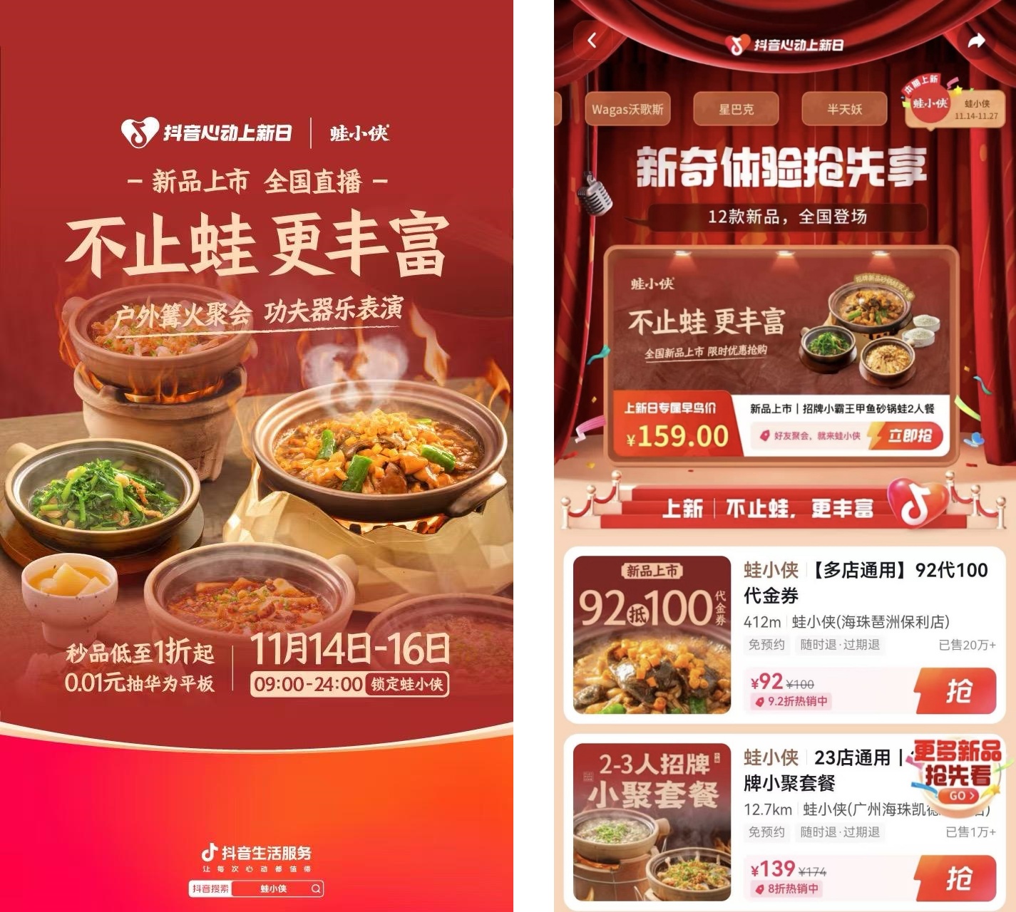 為熱烈慶祝新品的全面上市,蛙小俠攜手「抖音心動上新日」特列推出了「不止蛙,更豐富」主題活動,不僅為大家奉上了沸騰砂鍋系列的心動上新品,還通過主理人空降直播間、東方文化演繹、戶外山谷直播等系列互動玩法,誠邀廣大吃蛙星人共赴蛙小俠,實現(xiàn)蛙肉自由,以一鍋熱氣騰騰的蛙鍋治愈整個冬日。