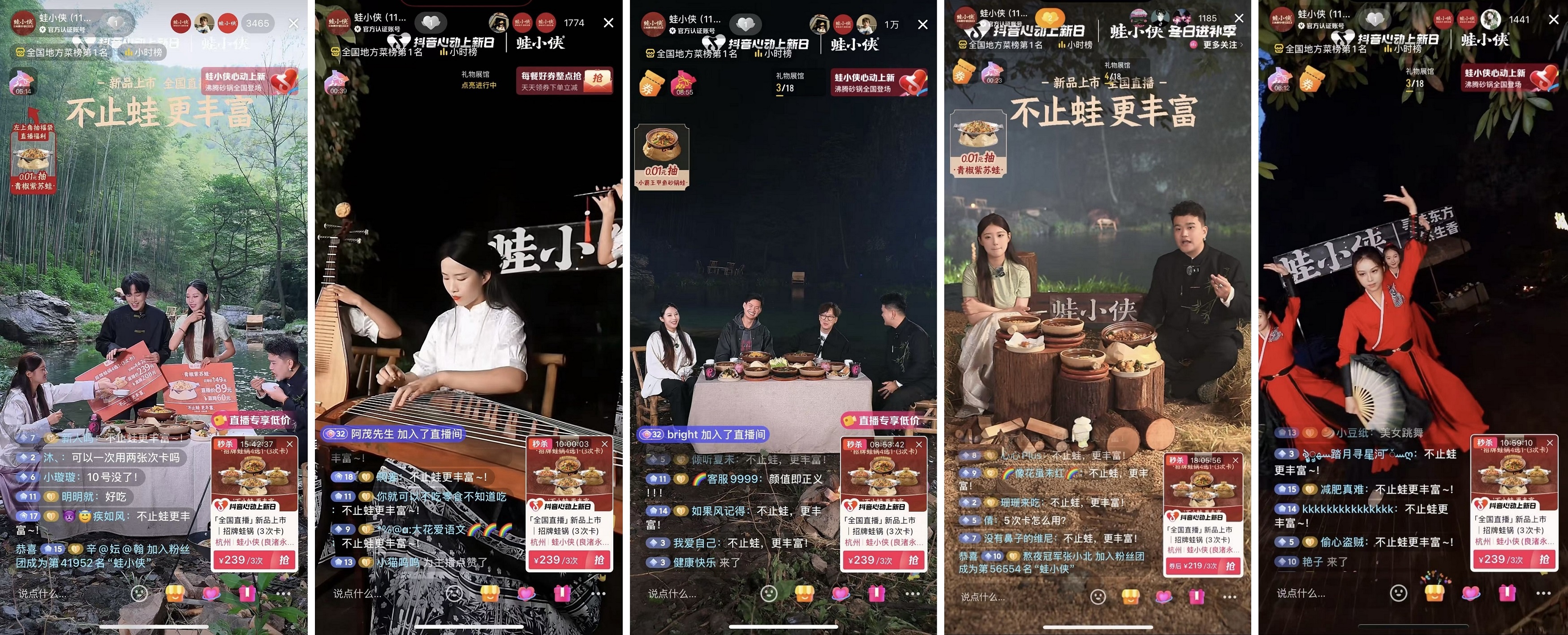 為了讓大家的直播體驗更上一層樓,蛙小俠品牌將場景精心選址于與品牌調性高度契合的戶外,于有山有水有人氣的風景勝地“優(yōu)雅”開播,主打為用戶營造氛圍感拉滿的視覺盛宴。在直播玩法上,蛙小俠更是突破傳統(tǒng)邊界,巧妙融入了非遺文化類與舞蹈類表演,不僅讓大家在蛙小俠門店大飽口福,還能在直播間大飽眼福,而且從側面彰顯了品牌“堅守文化根基,傳承文化精髓”的理念愿景。此外,品牌還特別邀請了蛙小俠主理人“空降”直播間,以親切自然的對話交流方式,向觀眾詳述了從“鐵鍋蛙”到“沸騰砂鍋”的革新歷程,讓用戶對品牌文化有了具象化認知,增強了品牌的親和力和感染力。