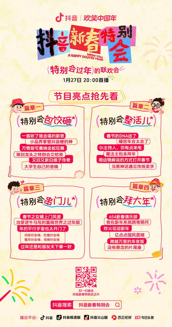 1月27日晚8點(diǎn),抖音新春特別會(huì)即將于抖音、抖音極速版、抖音火山版、西瓜視頻、今日頭條上線首播。