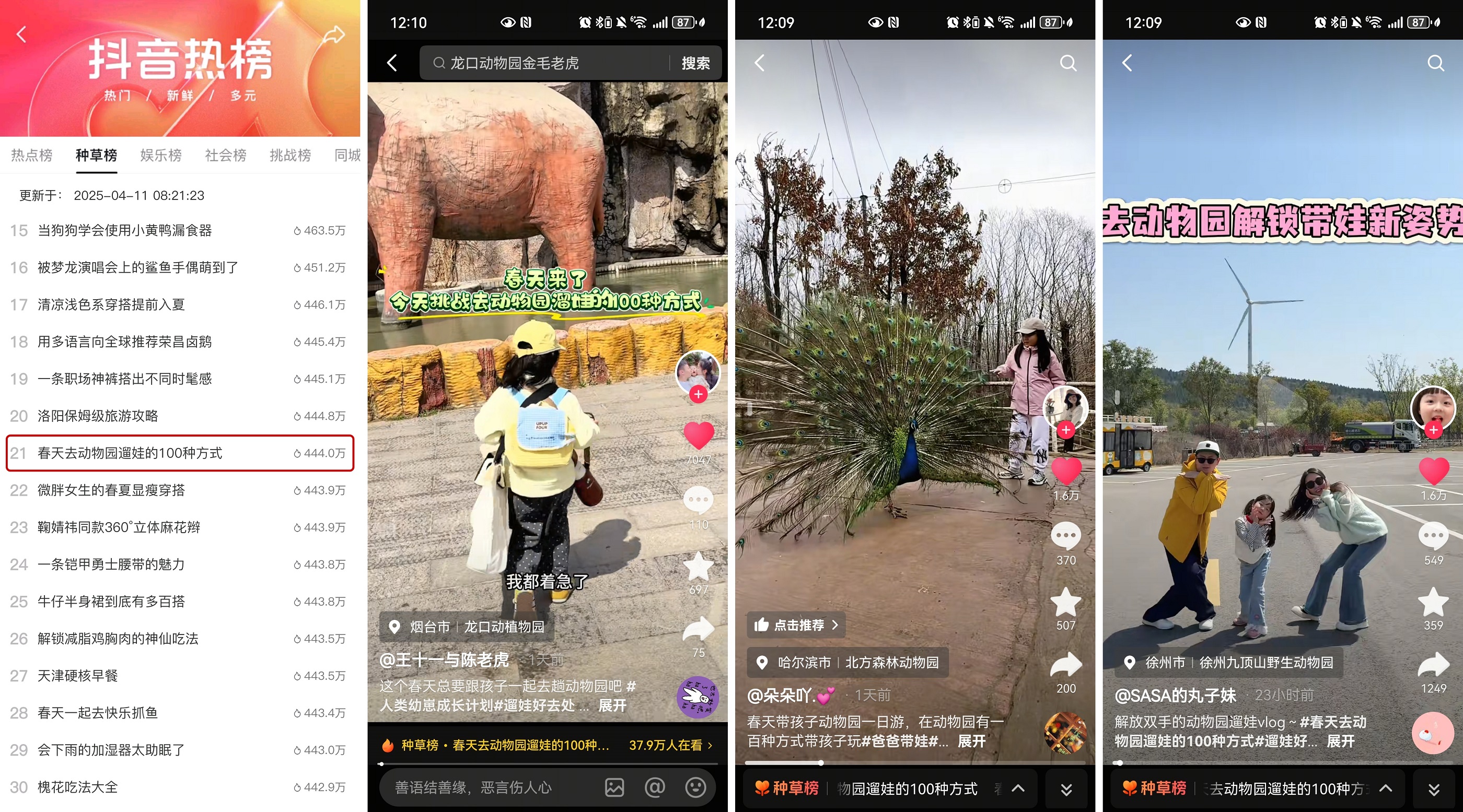 抖音站內(nèi),更是有不少家長分享著他們與孩子在動物園里的溫馨瞬間,話題#春天去動物園遛娃的100 種方式 更是持續(xù)升溫。@SASA的丸子妹 記錄了和小羊駝之間純粹而美好的互動,這即是自然的珍貴饋贈,也是寶爸寶媽一直在追尋的歡樂與溫暖;@王十一與陳老虎 分享了婉婉在動物園里被小動物們的可愛硬控的一整天,喂長頸鹿、追小雞,引得爸媽直呼動物比他們還會帶娃;@朵朵吖 記錄了雖然爸爸帶娃很是兵荒馬亂,但小動物的活潑可愛很快就撫平了這些……跟隨著達(dá)人們的鏡頭,萌娃們從繪本走進(jìn)真實的動物世界,時光在他們的互動中變得無比奇妙,也治愈著我們這些“屏幕前”的大朋友。