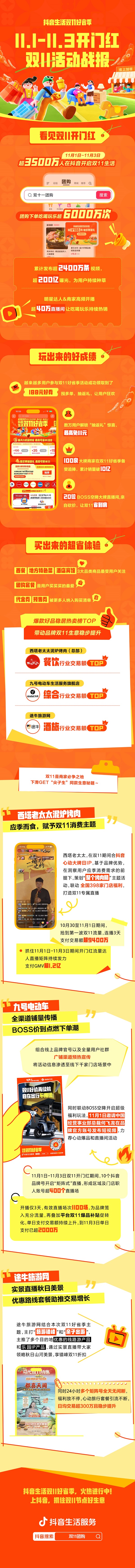抖音生活雙11好省季活動(dòng)于11月1日正式開(kāi)啟,11月1日-11月3日“雙11開(kāi)門(mén)紅”期間,超3500萬(wàn)人在抖音生活服務(wù)開(kāi)啟雙11狂歡,下單吃喝玩樂(lè)團(tuán)購(gòu)超6000萬(wàn)次。