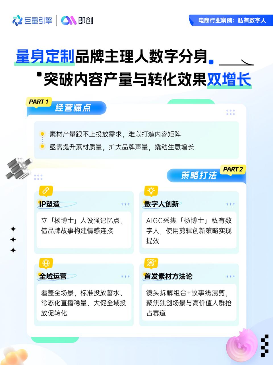 打造「楊博士」專業(yè)人設(shè),借品牌故事構(gòu)建情感連接;采集定制化私有數(shù)字人,結(jié)合剪輯策略提升素材生產(chǎn)效率。全域運營覆蓋標準投放蓄水、常態(tài)化直播穩(wěn)量、大促全域投放促轉(zhuǎn)化全鏈路,搭配鏡頭拆解組合與故事線混剪的素材方法論,搶占高價值人群賽道。