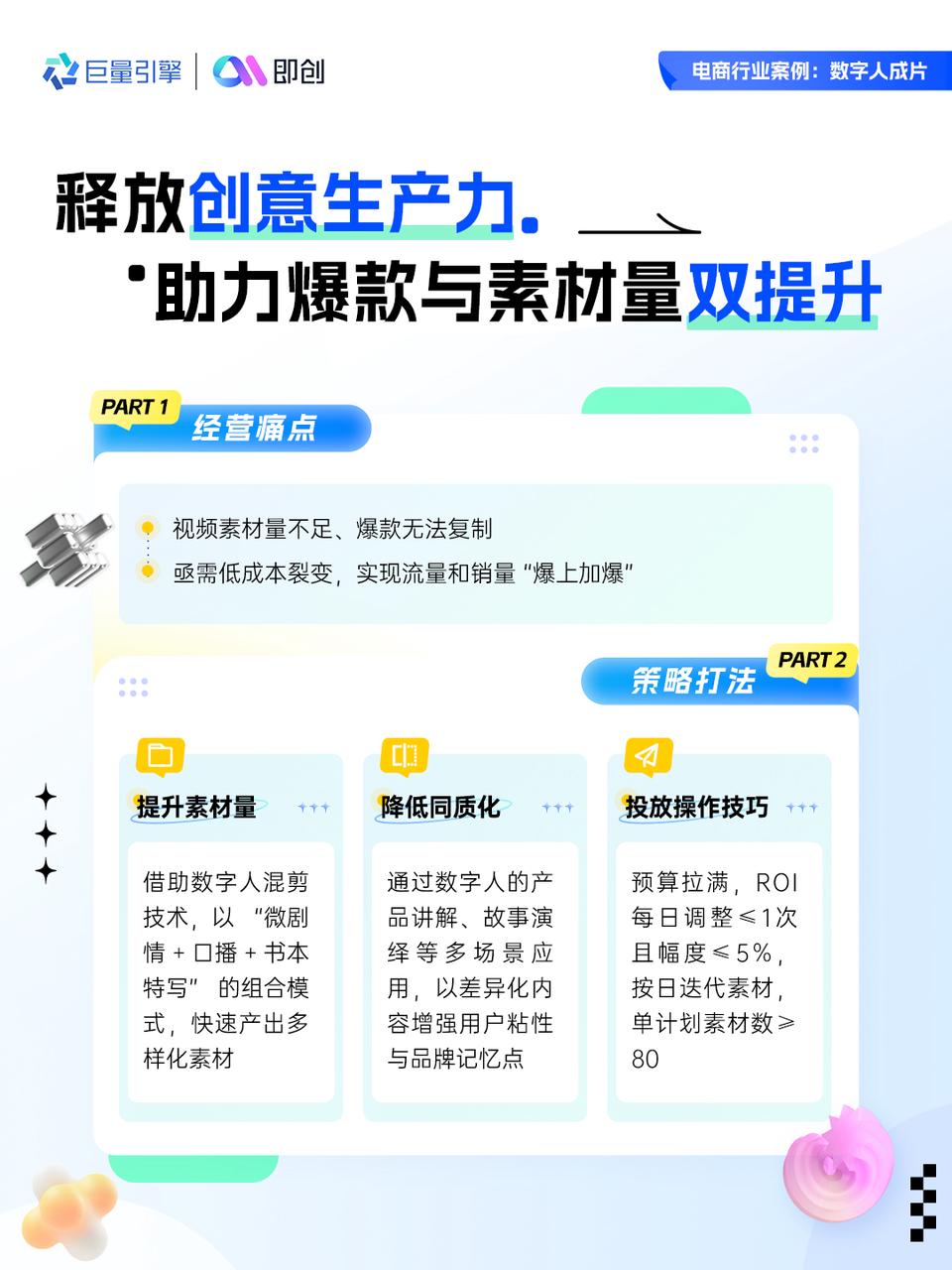 提升素材量,沿用爆款形式,采用微劇情+口播+書本特寫組合,打造新穎素材。同時借助數(shù)字人在商品介紹、故事講解等多種場景發(fā)力,增強品牌記憶點;預算拉滿,ROI每日調(diào)整≤1次且幅度≤5%,按日迭代素材,單計劃素材≥80條。讓品牌實現(xiàn)提效,做到素材有量、爆款有質(zhì)。