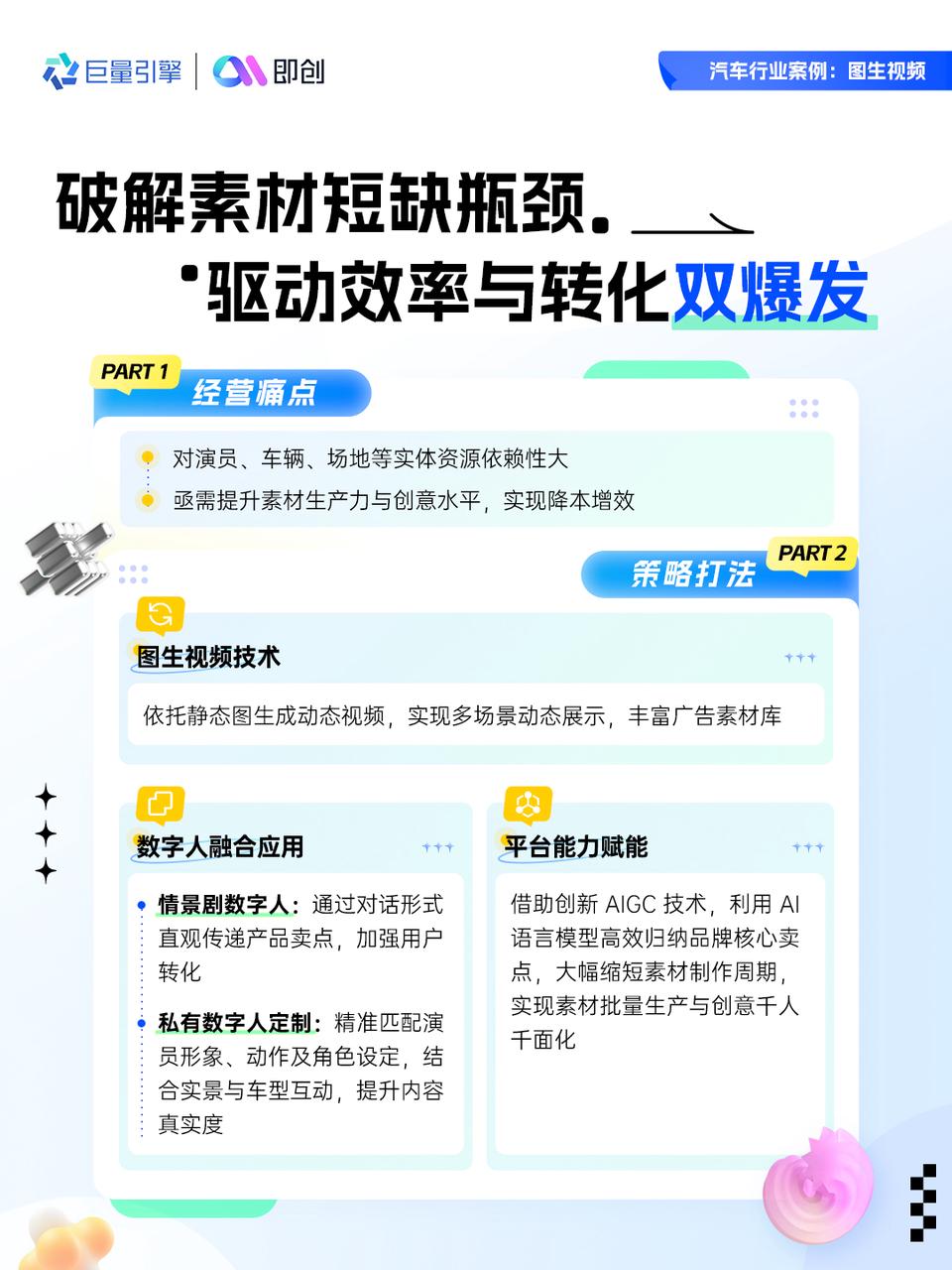 通過一鍵將圖片生成多場景展示視頻,豐富廣告素材庫,實現(xiàn)創(chuàng)意的多樣化;搭配數(shù)字人情景化營銷,對話式呈現(xiàn)產(chǎn)品賣點,強化轉(zhuǎn)化引導;私有數(shù)字人定制,精準匹配演員形象、動作及角色設(shè)定,結(jié)合實景與車型互動,提升內(nèi)容真實度;同步利用AI語言模型生成千人千面創(chuàng)意,實現(xiàn)汽車行業(yè)營銷新突破!