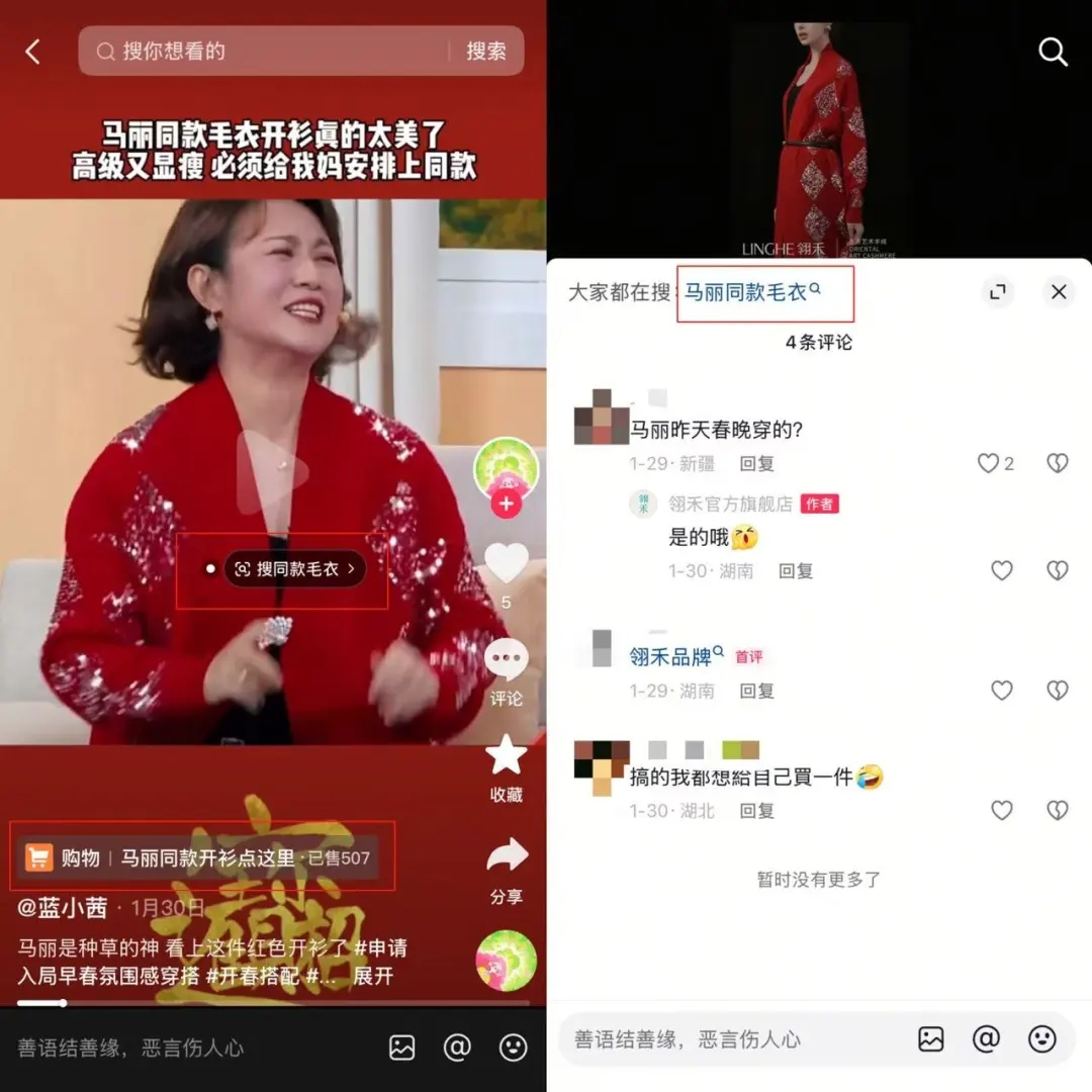 以馬麗同款的紅色毛衣開衫為例,在抖音電商的銷量持續(xù)攀升。有消費者在評論區(qū)表示:“除夕春晚后,馬上在抖音搜索同款。”