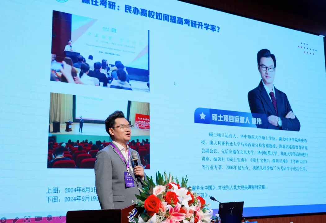 11月2日,湖北黃岡,在湖北省素質(zhì)教育研究會高等教育分會2024年年會暨第七屆大學生素質(zhì)教育高峰論壇上,湖北省素質(zhì)教育研究會副會長、湖北華素杯教育執(zhí)行董事、碩士項目運營人童偉作主題為《贏在考研:民辦高校如何提升考研錄取率》的報告。