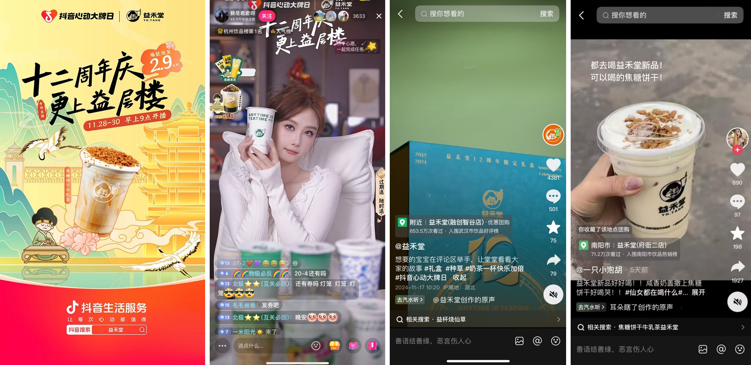 “大場直播收割+短視頻持續(xù)種草,益禾堂全面發(fā)力引燃周年慶熱潮”。