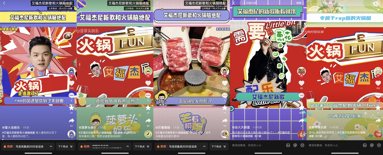 本次抖音生活服務(wù)平臺(tái)牽頭,反饋極為驚喜,強(qiáng)調(diào)文化語(yǔ)境的同時(shí),也是將各個(gè)火鍋品牌的文化更進(jìn)一步呈現(xiàn)出來(lái),讓用戶看到了專屬于每一種火鍋品牌的特質(zhì)。在文化力激增的過(guò)程中,IP運(yùn)營(yíng)趁熱打鐵,繼續(xù)在大品類文化背景下,加力輸出更多維、更細(xì)分的文化融合方式,包括聯(lián)動(dòng)知名rapper艾福杰尼定制抖音生活火鍋季主題曲BGM《火鍋fun》,為站內(nèi)內(nèi)容池渲染火鍋熱烈情緒氛圍的同時(shí),通過(guò)可以裂變的活動(dòng)玩法讓更多火鍋內(nèi)容生長(zhǎng)出來(lái)。