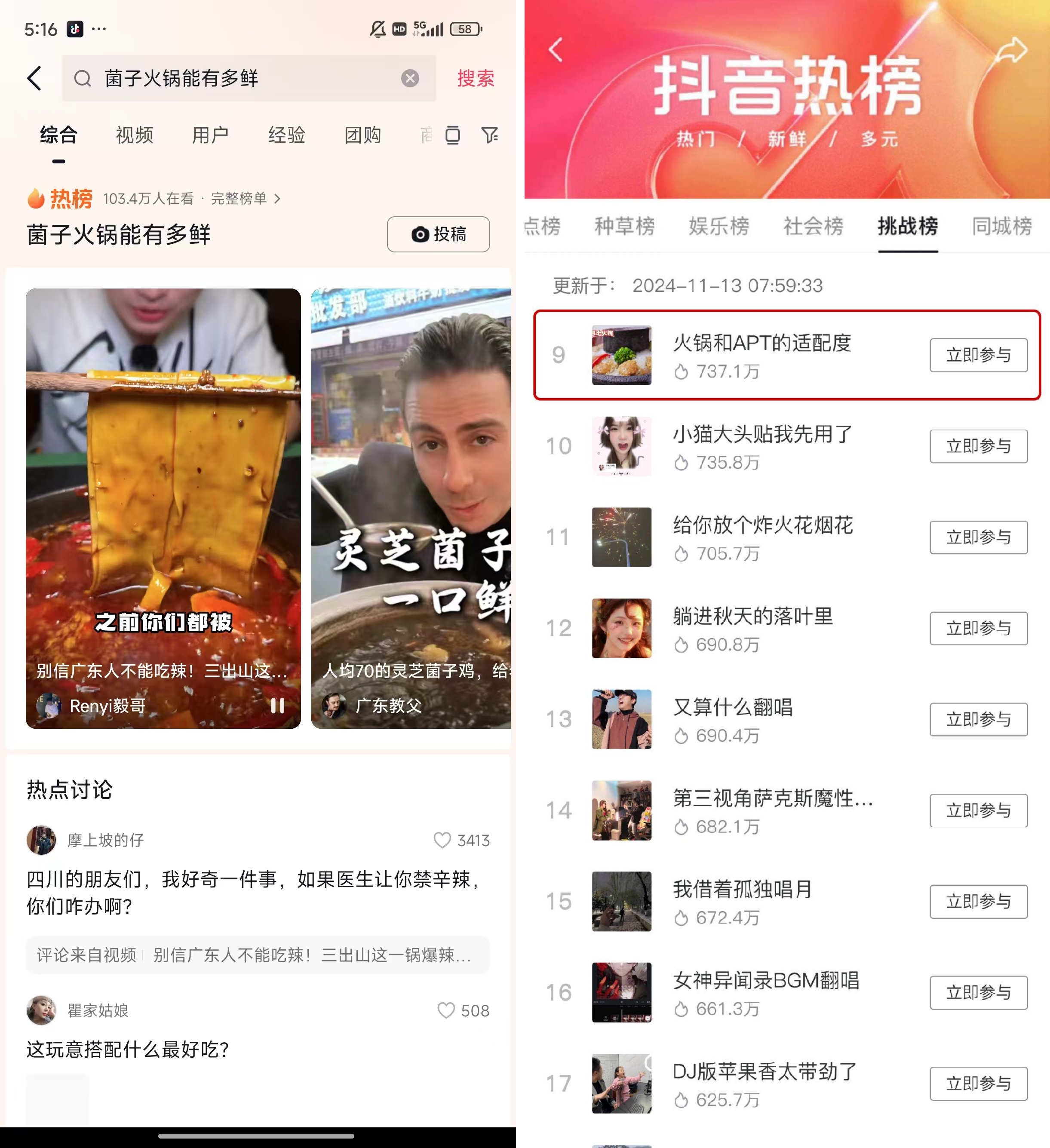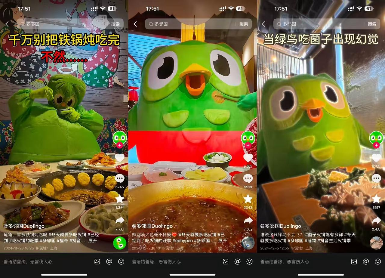 另一方面,則是借勢(shì),用更多圈層的影響力,間接打造細(xì)分火鍋內(nèi)容,讓火鍋品類潛移默化地影響大眾心智。還是地域特色火鍋內(nèi)容,抖音生活火鍋季在UGC之外,聯(lián)動(dòng)了很會(huì)與年輕人social的IP多鄰國(guó)以及各地文旅等進(jìn)行了聲量借勢(shì),包括結(jié)合站內(nèi)流行曲目APT打造洗腦傳播、輸出趣味性夸張菌子火鍋特質(zhì)的內(nèi)容等,都一度被頂上熱門(mén)。