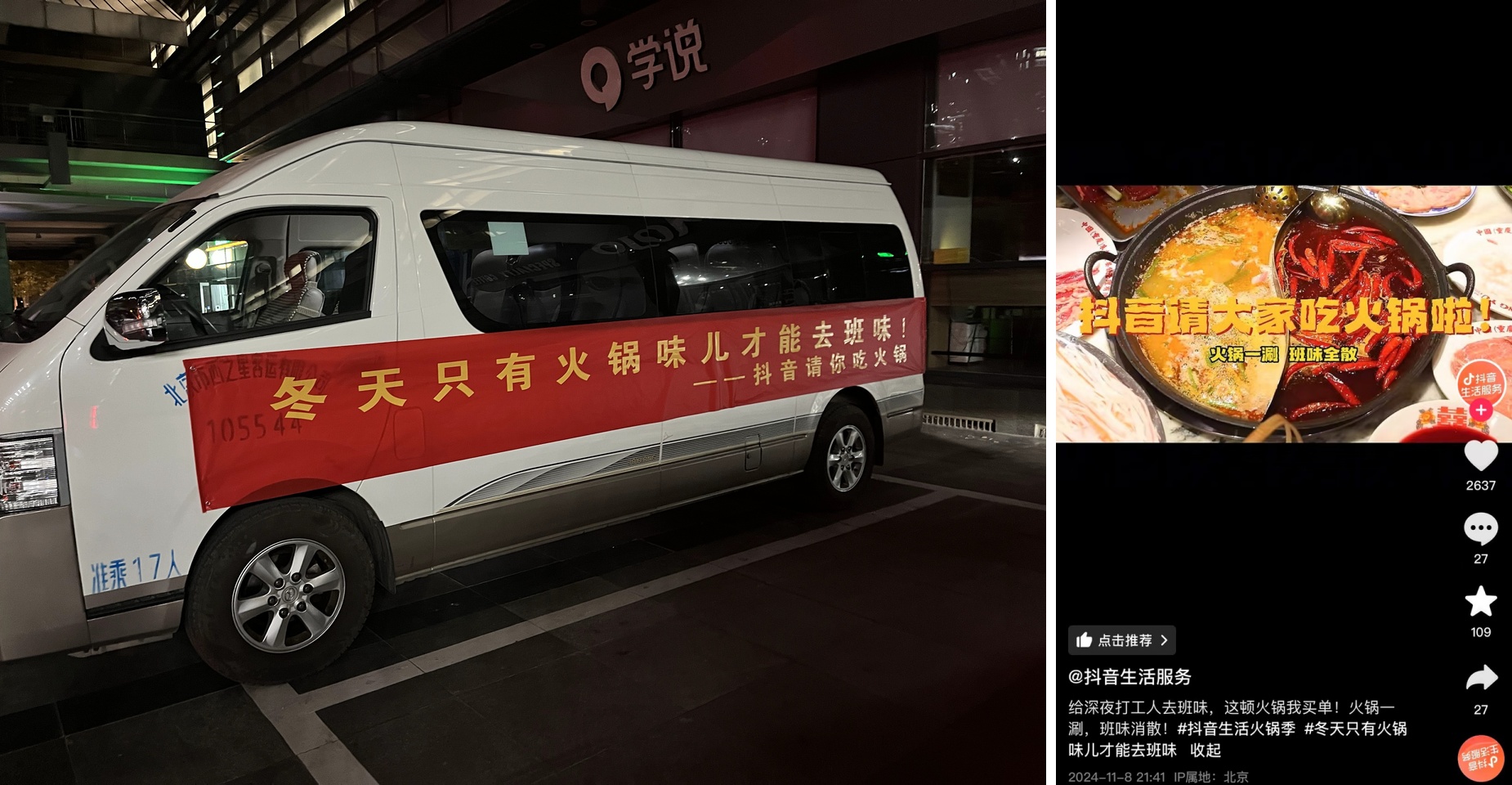 這份權(quán)益活動(dòng),不只是抽獎(jiǎng)這么單調(diào),還選擇了一個(gè)切入點(diǎn):將火鍋情緒落到了年輕人覆蓋最廣的人群上——上班族。在寒冷的工作日深夜,抖音生活服務(wù)派出首批專車(chē),接上一群剛加完班的上班族涮鍋。當(dāng)一群陌生年輕人,在一場(chǎng)免費(fèi)火鍋局中快樂(lè)侃大山時(shí),被治愈的不只是轆轆饑腸,還有心靈深處。