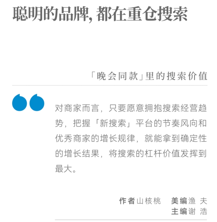 區(qū)別于傳統(tǒng)貨架電商的搜索經(jīng)營(yíng),以抖音電商為代表的「新搜索」正成為不少品牌商家收獲生意爆發(fā)、放大品牌聲量的關(guān)鍵陣地。在今年春節(jié)經(jīng)營(yíng)期間,一大批商家因?yàn)樵诙兑綦娚套龊盟阉鳎琛竿頃?huì)同款」孵化新爆款、收獲新人群,穩(wěn)穩(wěn)地接住了春晚的「潑天流量」。
