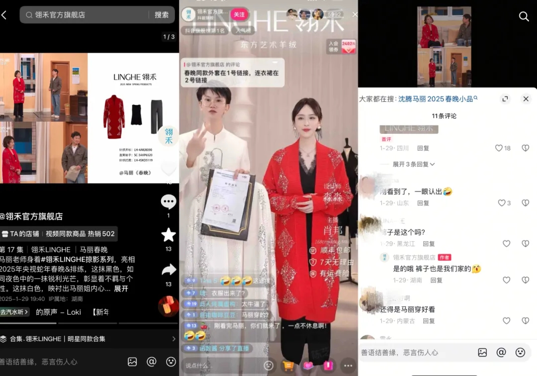 本土新中式服飾品牌翎禾 LINGHE 在去年龍年春晚就憑借「馬麗同款白色大衣」巧妙出圈,今年春晚也不例外。當(dāng)馬麗穿著翎禾 LINGHE 出現(xiàn)在小品《金龜婿》中時(shí),相關(guān)熱點(diǎn)#必須讓我媽擁有馬麗同款開(kāi)衫 隨即被用戶搜上熱榜,品牌也快速做出反應(yīng),認(rèn)領(lǐng)熱點(diǎn)同款,連夜開(kāi)啟直播,有不少網(wǎng)友就表示:“速度可以啊,馬麗同款,一眼就看出來(lái)了”。