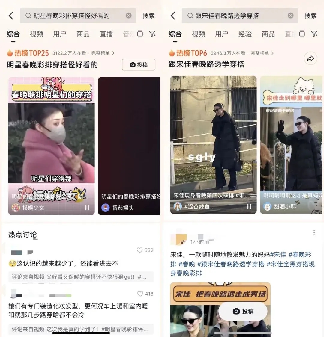 早在春晚前,一批關(guān)于明星春晚彩排的路透穿搭已成為熱點(diǎn),比如因姐感和地母系風(fēng)格出圈的宋佳,在抖音站內(nèi)單個(gè)話題#跟宋佳春晚路透學(xué)穿搭 瀏覽量就接近6000萬(wàn),相關(guān)視頻評(píng)論區(qū)下方,網(wǎng)友也紛紛詢問(wèn)同款穿搭鏈接,與「宋佳同款」相關(guān)的商品銷量漲幅也明顯突出,熱點(diǎn)上線3日相關(guān)搜索PV就增長(zhǎng)108倍,標(biāo)題SEO「宋佳同款」的商品3日搜索成交環(huán)比上漲39%。