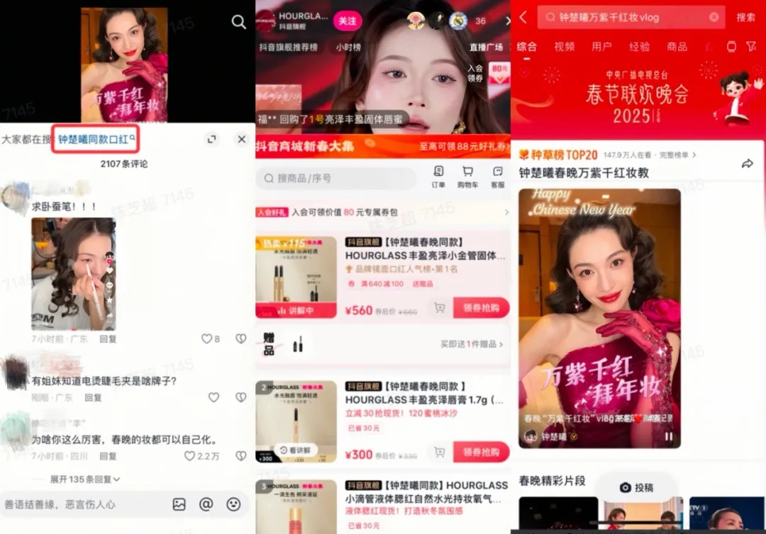 像是今年的蛇年春晚,在抖音電商,宋佳路透視頻中的羽絨服和褲子,鐘楚曦和倪妮的同款口紅,馬麗在小品《金龜婿》中的同款紅色毛衣全都成了搜索熱門(mén)......無(wú)論是服飾、美妝等春晚熱門(mén)品類,抑或是玩具等小眾品類,從頭部品牌到中小商家,一批「晚會(huì)同款」在抖音電商迎來(lái)生意爆發(fā)。