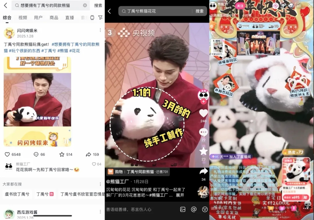 在今年春晚倒計(jì)時(shí)節(jié)目《春晚等著你》中,被丁禹兮抱著的熊貓玩偶就成了用戶關(guān)注的熱點(diǎn),@熊貓工廠 快速策劃#想要擁有丁禹兮的同款熊貓 話題,內(nèi)容團(tuán)隊(duì)在直播當(dāng)天集體實(shí)時(shí)錄屏,積累并發(fā)布了與丁禹兮同款熊貓相關(guān)的諸多優(yōu)質(zhì)短視頻內(nèi)容素材,如“小丁的第一支熊貓寶寶”“小丁的同款花花下臺(tái)后去了哪里呢?”“小丁一眼就愛(ài)上的熊貓是……”。