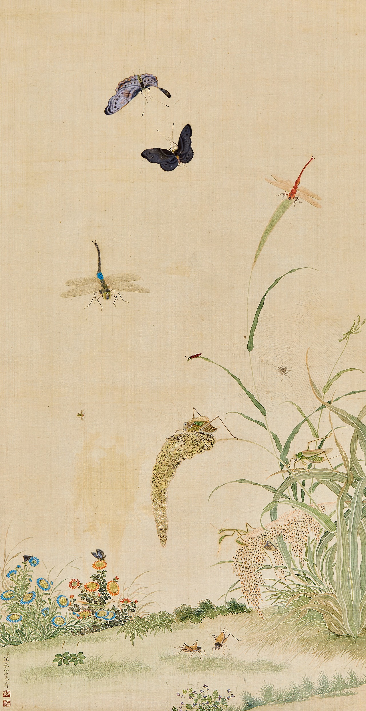 Lot 709 汪承霈(?-1805) 《秋色秋聲》 絹本/立軸 78×40cm 約2.8平尺 鈐?。撼婿?、恭畫(huà) 款識(shí):汪承霈恭繪。 估價(jià): RMB 35,000-55,000 汪承霈為清乾隆時(shí)期的書(shū)法家和詞臣畫(huà)家,官至兵部尚書(shū),汪由敦的次子,父子二人深受乾隆帝器重,書(shū)畫(huà)作品亦頗得皇帝青睞,多次在其畫(huà)中題詩(shī),著有《時(shí)晴齋集》。 此幅《秋色秋聲》落款“臣汪承霈恭繪”,可知是獻(xiàn)給乾隆的畫(huà)作,絹本設(shè)色,描繪蝴蝶、蜻蜓、螳螂、蜘蛛、蚱蜢、蟋蟀等草蟲(chóng),細(xì)筆勾勒輪廓,再層層暈染,敷色明麗淡雅,栩栩如生。汪承霈傳世作品題材雖多為平常之物,但意趣卻清新脫俗,用色淡雅,工整華麗,有皇家富貴之氣。而且受到西畫(huà)影響,出現(xiàn)透視、明暗對(duì)比等傳統(tǒng)中國(guó)畫(huà)中未見(jiàn)的技法。