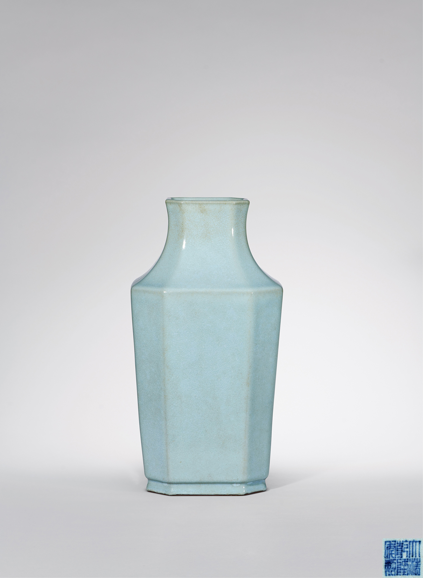 Lot 2158 清乾隆 仿汝釉八方瓶 尺寸:高33.3cm “大清乾隆年制”篆書(shū)款 估價(jià):RMB 800,000-1,000,000 宋代五大名窯以汝窯青瓷最受后世稱頌,明清兩代景德鎮(zhèn)御窯廠均有仿制,其中尤以雍乾兩朝為最佳,仿汝釉面玻璃質(zhì)強(qiáng),光亮瑩潤(rùn)。本品底款以青花篆書(shū)“大清乾隆年制”六字款,為典型乾隆朝,唐英督陶時(shí)期的仿古作品。原為日本藏家舊藏,在日本傳統(tǒng)美學(xué)影響之下,極有可能曾為茶道之器,用以布置茶室,為插花之花瓶。造型古樸大氣,釉色瑩潤(rùn)自然,是觀賞陳設(shè)的不二之選。