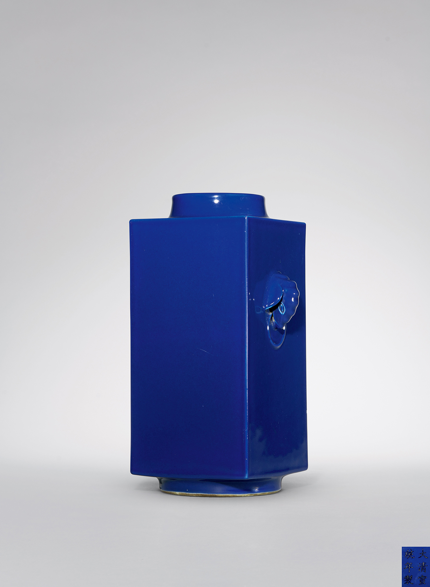 Lot 2135 清宣統(tǒng) 霽藍(lán)釉象耳方瓶 尺寸:高29cm 估價(jià):RMB 150,000-200,000