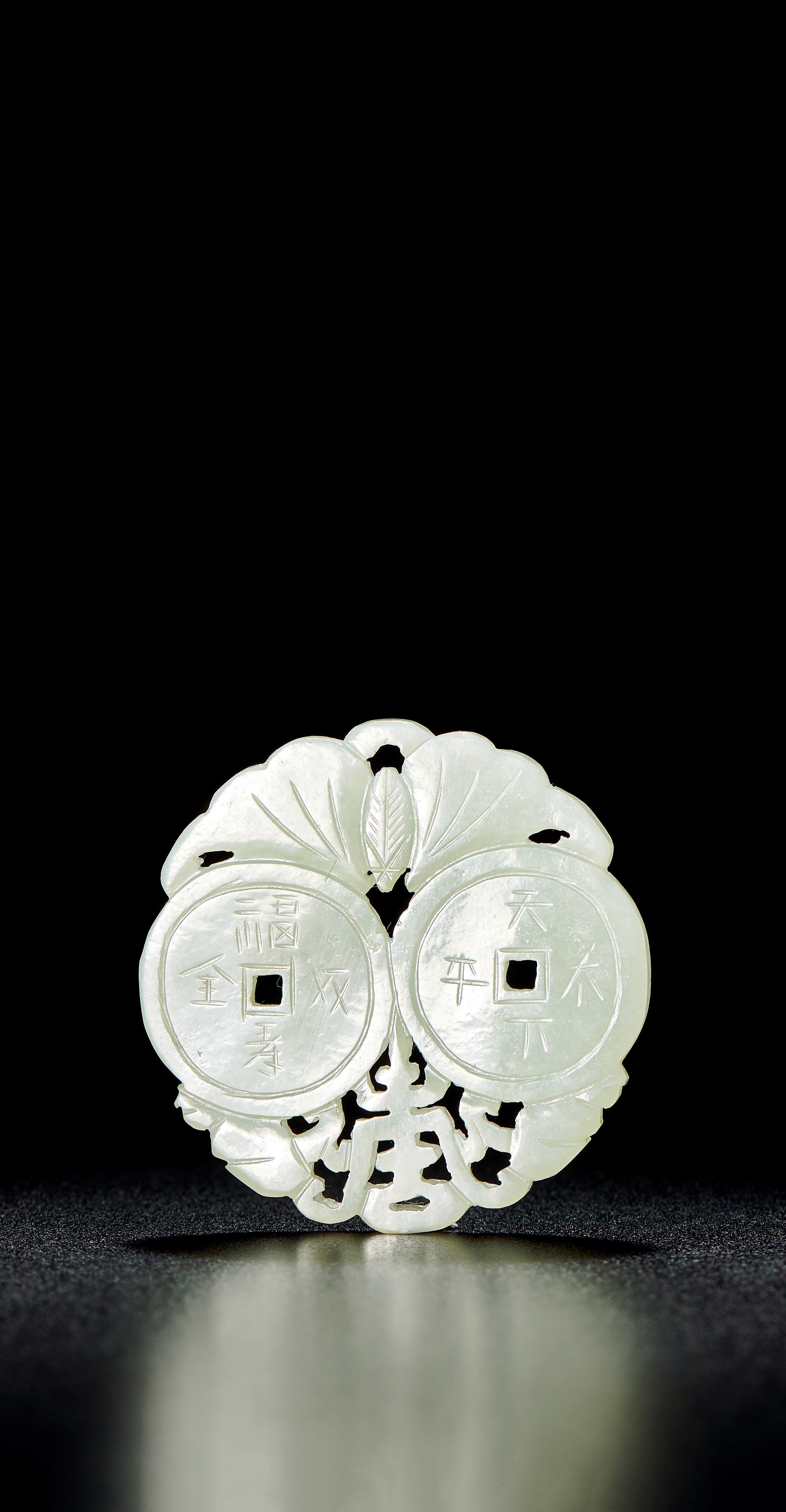 Lot 2027 清中期 白玉福在眼前珮 尺寸:直徑5.7cm 估價(jià):RMB 10,000-20,000 本品細(xì)潤(rùn)純凈,整體雕鑄而成。上方透雕蝙蝠,下方為錢幣圖案,兩者宛若自然,構(gòu)思巧妙,造型生動(dòng)飽滿。寓意美好祥和、富足,寄托了古人美好的愿望。