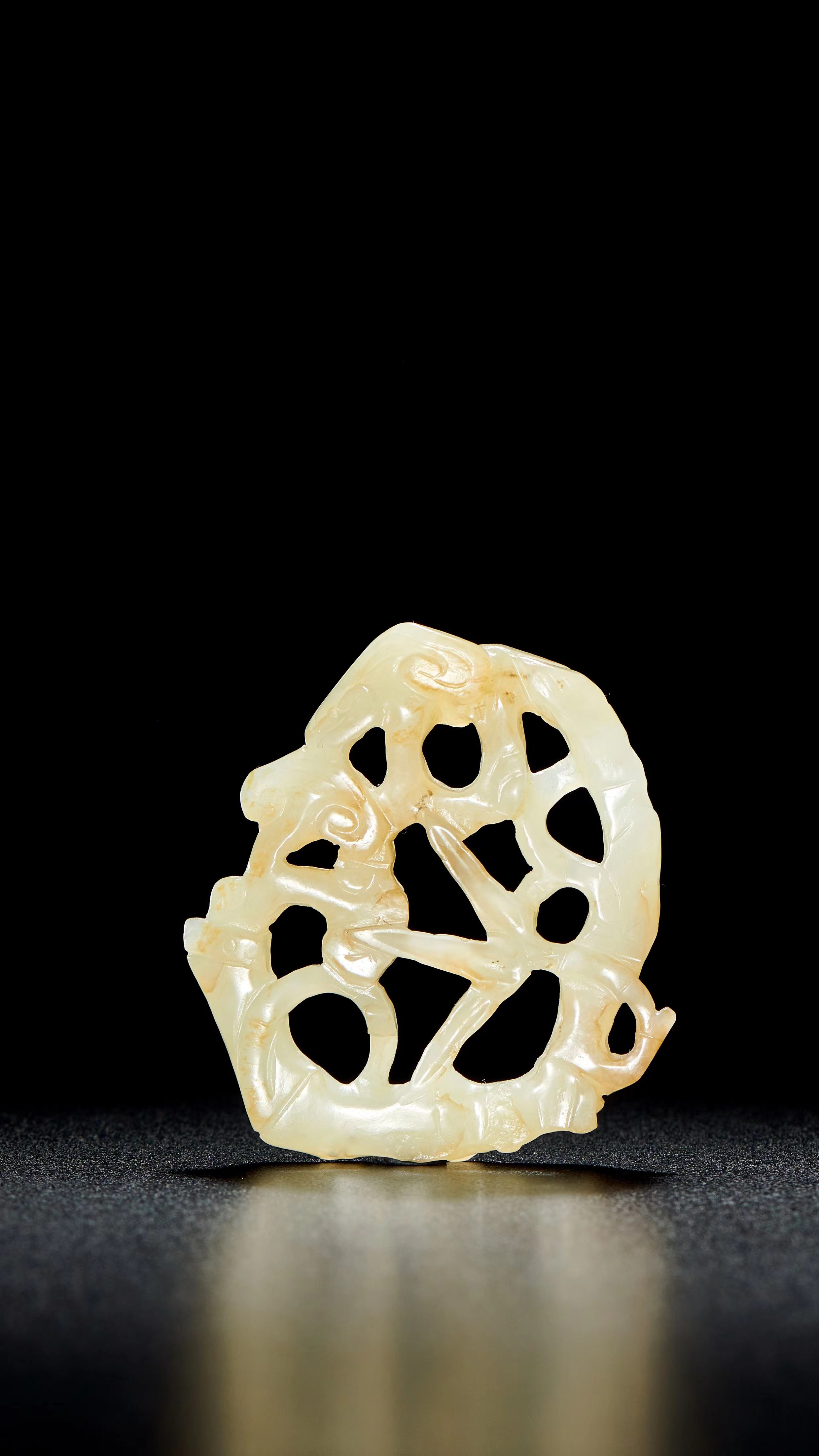 Lot 2042 清中期 白玉靈芝節(jié)節(jié)高珮 尺寸:長(zhǎng)6cm 估價(jià):RMB 25,000-35,000 竹節(jié)佩,選取白玉,宛若凝脂,光澤透亮,包漿均勻。透雕竹節(jié)形,竹節(jié)疏朗,枝干粗壯,竹葉樹(shù)枝布局錯(cuò)落有致,工藝嫻熟。器物紋飾布局舒緩有致,韻味清雅。