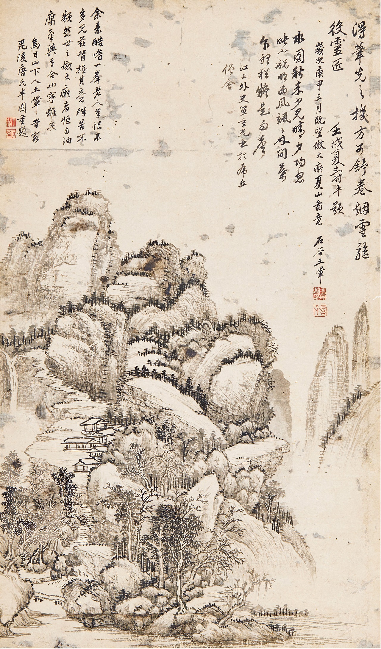 Lot 840 王翚(1632-1717) 《夏山圖》 紙本/立軸 62.5×36.5cm 約2.1平尺 鈐?。和趿毸接?、石谷子、王翚、石谷 款識(shí):歲次庚申三月既望,仿大癡夏山圖意。石谷王翚。 惲壽平、笪重光題識(shí) 估價(jià): RMB 220,000-300,000 清初畫(huà)圣王翚,醉心于丹青,博取宋元各家精華,朝夕與虞山相伴,探其凌幽,得其勝趣,寫(xiě)眼中丘壑,學(xué)古人而不泥古,形成自家山水面貌。早年具有清麗深秀的風(fēng)致,晚年轉(zhuǎn)向蒼茫深厚。 此幅《夏山圖》給人以蒼古秀潤(rùn),恬淡寧?kù)o之美。自下而上,層次清晰,結(jié)構(gòu)有序,翠峰高聳,煙嵐環(huán)繞,叢林密布,山石之間,一線飛瀑如練,傾瀉直下,蜿蜒的山間小路從茅屋前穿過(guò),一派可游可居的山水景致。