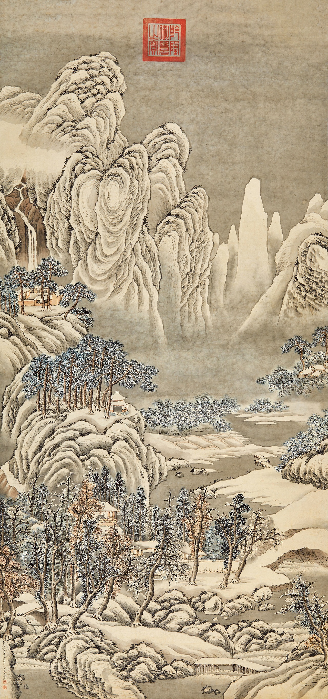 Lot 868 董誥 (1740-1818)《北海營(yíng)邱圖》 紙本 立軸 174×83cm 鈐?。撼颊a敬畫(huà) 款識(shí):李咸熙自寫(xiě)北海營(yíng)邱圖。臣董誥敬臨。 鑒藏?。呵∮[之寶 估價(jià):RMB 1,500,000-1,800,000 董邦達(dá)、董誥父子是清宮重要畫(huà)家,他們的作品既能迎合皇帝喜愛(ài)的盛世升平氣象,又有文人畫(huà)家所追求的幽遠(yuǎn)意境。董誥是清宮第二代詞臣畫(huà)家的中堅(jiān)力量,書(shū)法繪畫(huà)備受乾隆皇帝賞識(shí)。 此作是董誥奉乾隆帝敕命,臨寫(xiě)內(nèi)府所藏的李成《北海營(yíng)邱圖》,畫(huà)成,呈皇帝御覽,并鈐蓋“乾隆御覽之寶”于上,款題“李咸熙自寫(xiě)北海營(yíng)邱圖,臣董誥敬臨”。雪景寒林是文人畫(huà)家頗為青睞的題材,此作勾皴與烘染相結(jié)合,以山石上大片留白以示雪意,表現(xiàn)出深山積雪中的尋幽之趣??占哦换臎?,清新而又渾厚,使觀者仿佛能呼吸到畫(huà)中寒濕而純凈清潤(rùn)的空氣,獲得心曠神怡的審美感受。