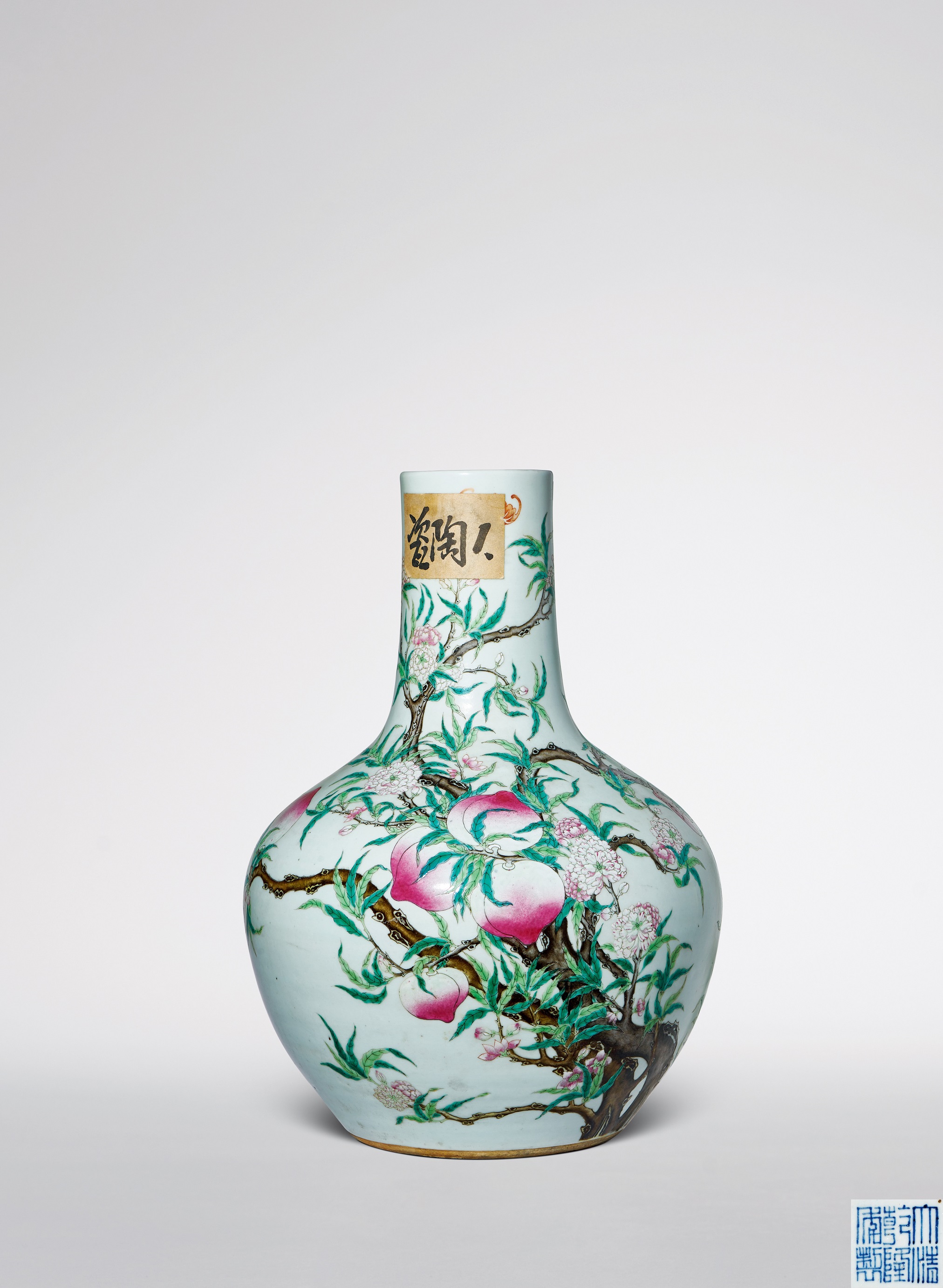 Lot 2311 清 粉彩九桃紋天球瓶 尺寸:高53cm “大清乾隆年制”篆書(shū)款 估價(jià):RMB 200,000-300,000 天球瓶始作于明初永樂(lè)、宣德時(shí)期,受外域器物影響深刻,后一度中斷,直至康熙晚期才恢復(fù)燒造,這一時(shí)期比例勻稱得當(dāng),在陳設(shè)瓶、尊類的器物中脫穎而出,是官窯之中的佳品。后世所制粉彩蟠桃紋天球瓶多以雍、乾時(shí)期的制品為藍(lán)本燒造而成。
