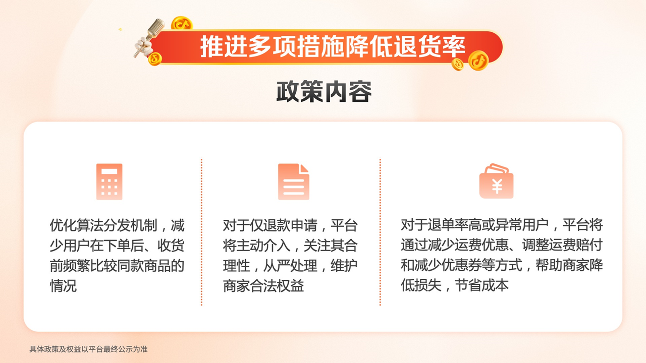 高退貨率是許多商家經(jīng)營過程中的痛點、難點,也是影響利潤空間的關(guān)鍵。抖音電商通過多項舉措穩(wěn)住退貨率,降低經(jīng)營損失,包括優(yōu)化算法分發(fā)機制、主動介入、調(diào)整優(yōu)惠等方式。