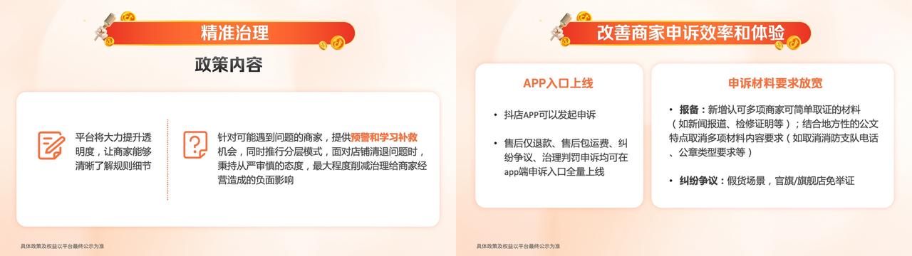 如何全方位提升商家體驗?抖音電商以商家需求為服務(wù)導(dǎo)向,推出一系列優(yōu)化舉措,包括提升平臺規(guī)則透明度、改善商家申訴效率和體驗、給遇到問題的商家提供預(yù)警和學(xué)習(xí)補救機會等。假如遇到糾紛爭議等問題,也可通過抖店APP發(fā)起申訴,得到圓滿解決。同時抖音電商放寬了申訴材料要求,新增認可多項商家可簡單取證的材料,并且結(jié)合地方性的公文特點取消多項材料內(nèi)容要求,提升取證效率,助力商家早日解決問題。