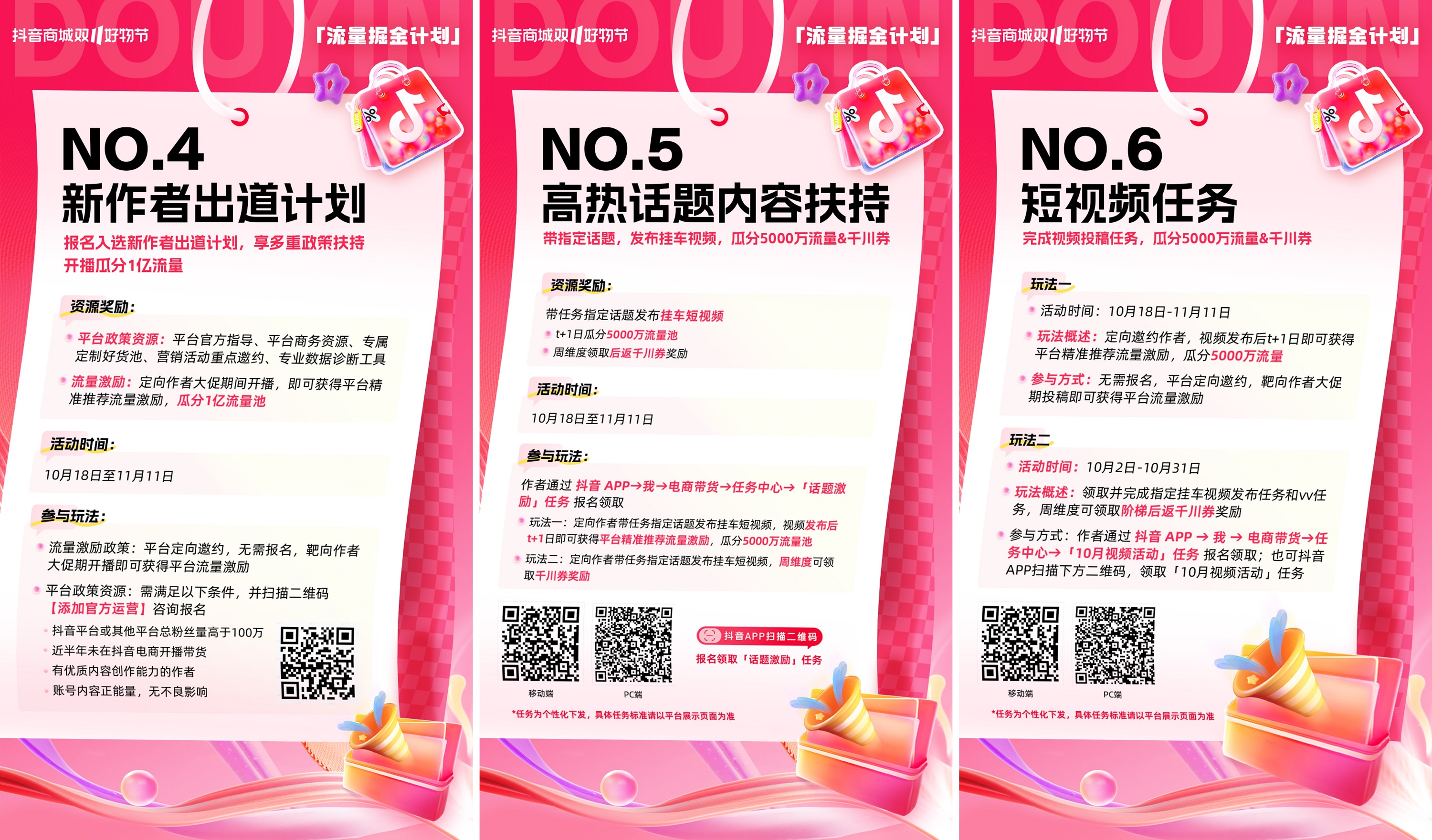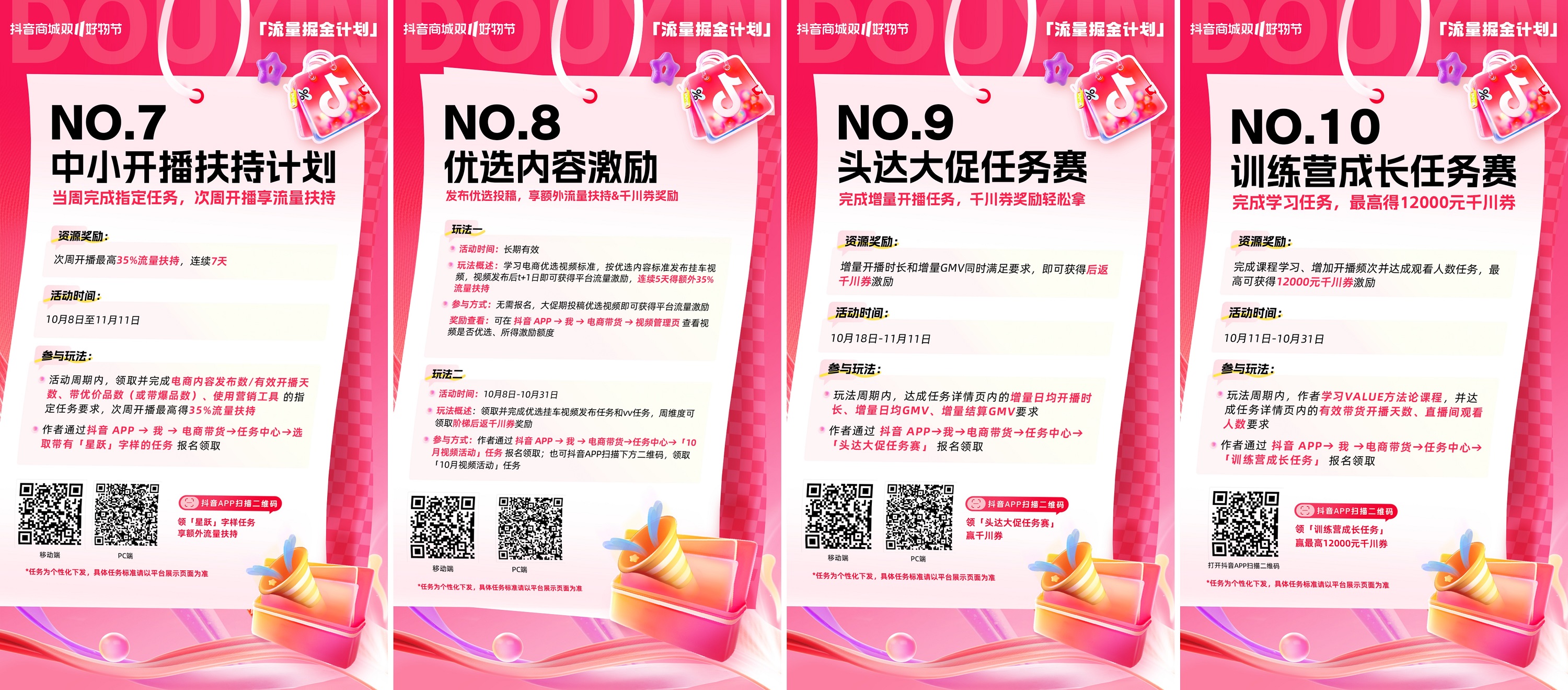 • 10月18日至11月11日期間,作者完成視頻投稿任務(wù),即可瓜分5000萬流量。10月2日至10月31日期間,作者領(lǐng)取并完成指定掛車視頻發(fā)布任務(wù),每周贏千川券獎(jiǎng)勵(lì)