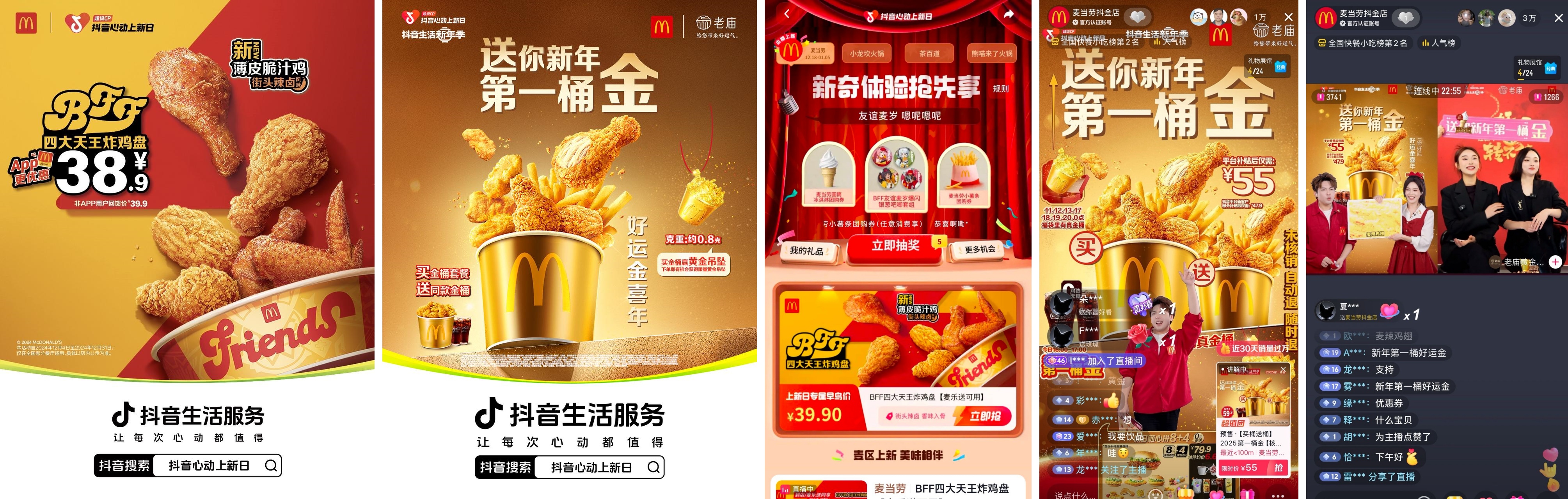 麥當(dāng)勞緊握新年旺季消費(fèi)需求,于12月6日至1月5日攜手老廟黃金強(qiáng)力渲染過節(jié)氣氛,依托雙品牌直播連麥、“買桶送桶”套餐福利、平臺團(tuán)購核銷抽取“真金桶”等熱門玩法,不僅輸出了“跨年不缺金”的新年儀式感,還引爆了一波“吃桶購金”的消費(fèi)熱潮。