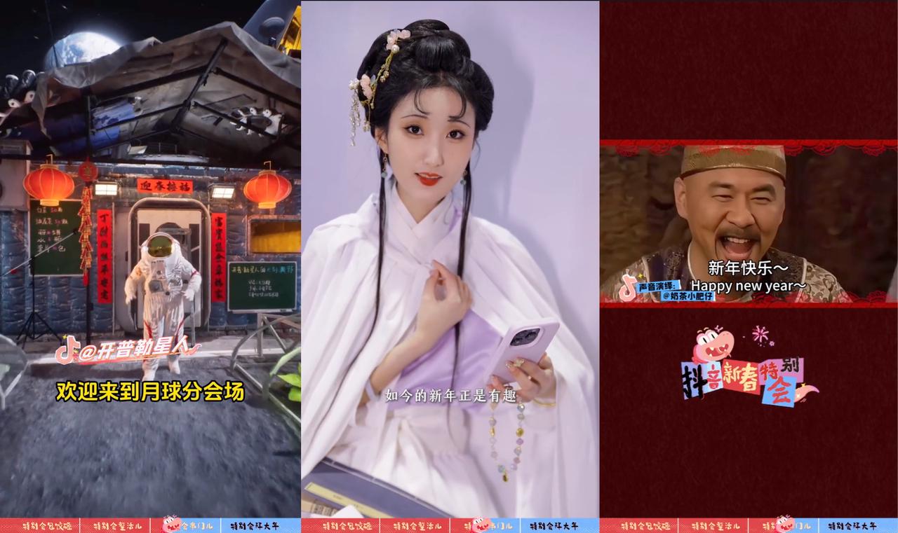 第三篇章特別會(huì)串門,給用戶展現(xiàn)出“在抖音里過年”的無限可能性,人們不僅可以在抖音記錄分享自己過年的場(chǎng)景,還能超越時(shí)間與空間,虛擬和現(xiàn)實(shí),在短劇里過年,在月球上、在“甄嬛宇宙”中過年,看到林黛玉穿越到現(xiàn)代來過年的場(chǎng)景。「抖音新春特別會(huì)」巧妙借鑒了春晚的內(nèi)容呈現(xiàn)形式,例如用分會(huì)場(chǎng)的模式,以全新的視角對(duì)大熱IP做新的詮釋,巧借化用,充滿創(chuàng)意。還有策劃大使作為主持人串場(chǎng),創(chuàng)作者明星送祝福環(huán)節(jié),都是對(duì)春晚模式的致敬。