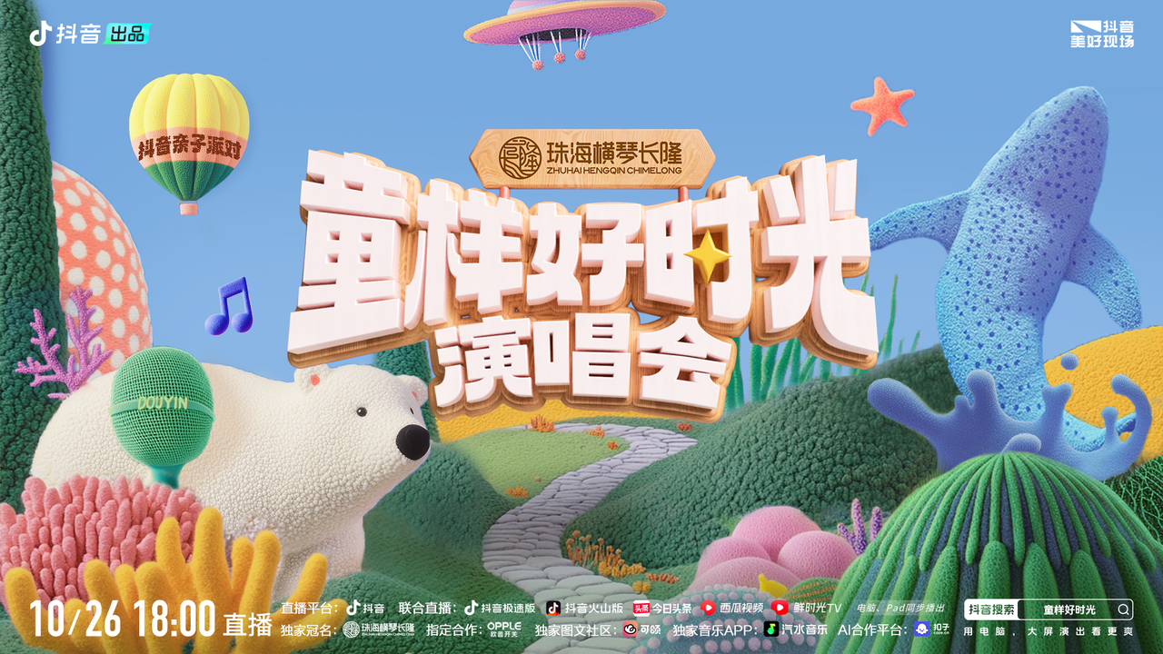 孩子們肆意盡情地吶喊、釋放著逃離日常束縛的勇氣 大人們閉眼大聲地歌唱,仿佛回到了無憂無慮的童年時光…… 一群熱愛音樂、追求快樂的人們齊聚演唱會現(xiàn)場 被音浪溫柔包裹著、限時共享同一顆心臟、真誠的對話與熱烈的回應 構筑起無數(shù)個鮮活閃亮的熱血瞬間 在音符世界里找回那份純粹的親子之樂與童年的歡愉 10月26日晚18:00 一場專為大小朋友們量身打造的夢幻盛宴即將拉開帷幕 抖音親子派對「童樣好時光演唱會」 將在珠海橫琴長隆海洋王國露天廣場與大家浪漫相約 誠邀大家跟隨音符旋律共舞 在這方充滿魔力的音樂天地里 重拾一份特別的童真美好時光