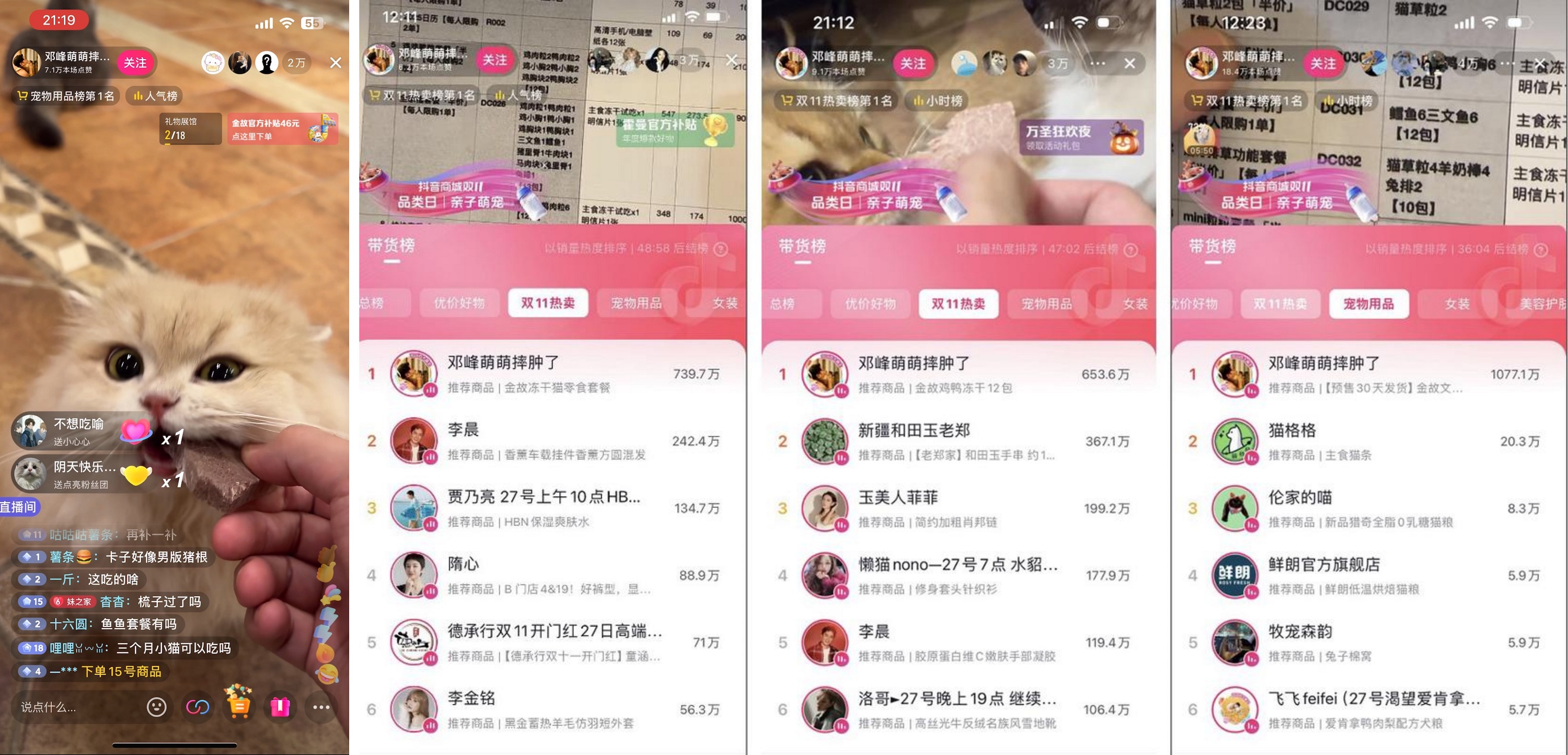 作為萌寵類頭部達人,@鄧峰萌萌摔腫了 帶著霸總卡子退休再就業(yè),認真營業(yè)的態(tài)度收獲了一票粉絲的喜愛,登陸帶貨榜的雙11熱賣榜、寵物用品榜TOP1。此外,@喬巴日記 與 @大王球兒 的合作也尤為引人注目。兩大愛干飯的萌主會面,針對凍干、罐頭等品類進行了回合制PK干飯,直播氣氛熱烈,吸引了大量觀眾圍觀的同時,也為直播贊助商家提升了認知與好感度。