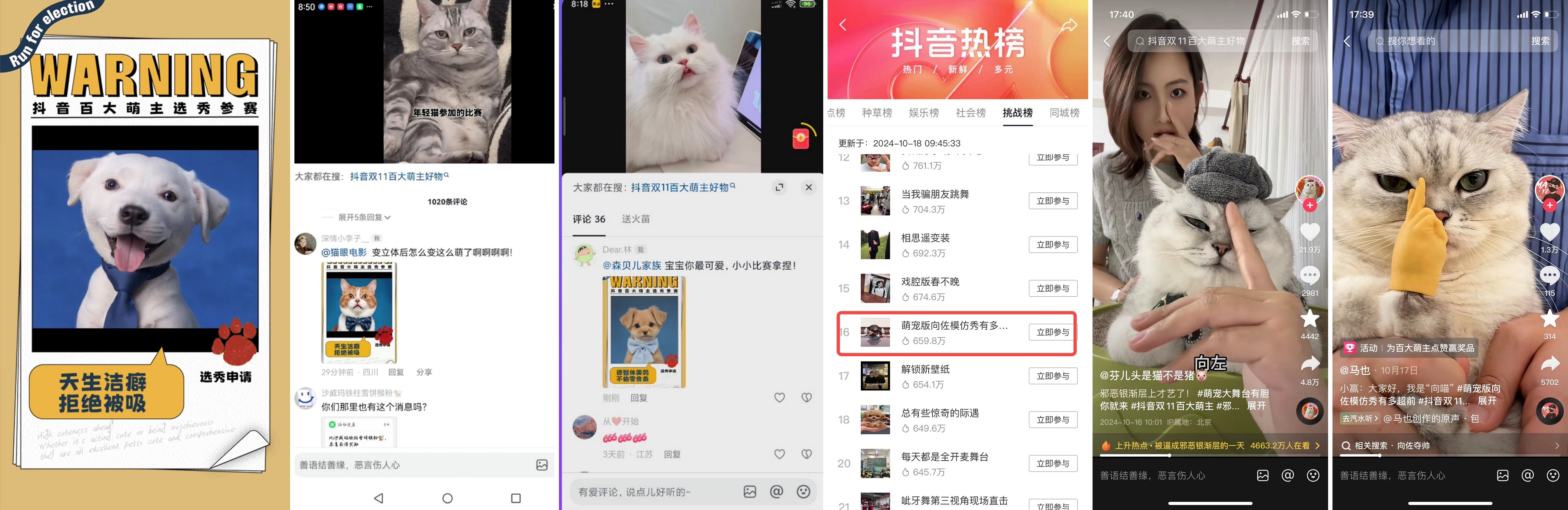 活動充分激發(fā)達人與用戶的創(chuàng)作欲,AI特效、cos玩梗、音樂創(chuàng)意等玩法涌現(xiàn)?!続I寵物出道照】站內特效憑借趣味、便捷的優(yōu)勢,贏得了廣泛青睞,不僅一眾明星達人利用該特效報名參與本次百大萌主選秀,更有眾多網(wǎng)友自發(fā)用特效隔空喊話其他IP參賽。期間,既寵物玩梗向佐的風潮席卷站內,引發(fā)了眾多博主的跟風模仿,帶動話題#萌寵版向佐模仿秀有多超前 迅速登陸抖音挑戰(zhàn)榜TOP16;更產出了“好煩做貓真的好難” “萌寵版atp挑戰(zhàn)” “一群小貓貓里為何選中我” “百萬運鏡貓咪版”等熱門bgm和視頻玩法,帶動這場選秀活動成為了一場全民娛樂的狂歡。