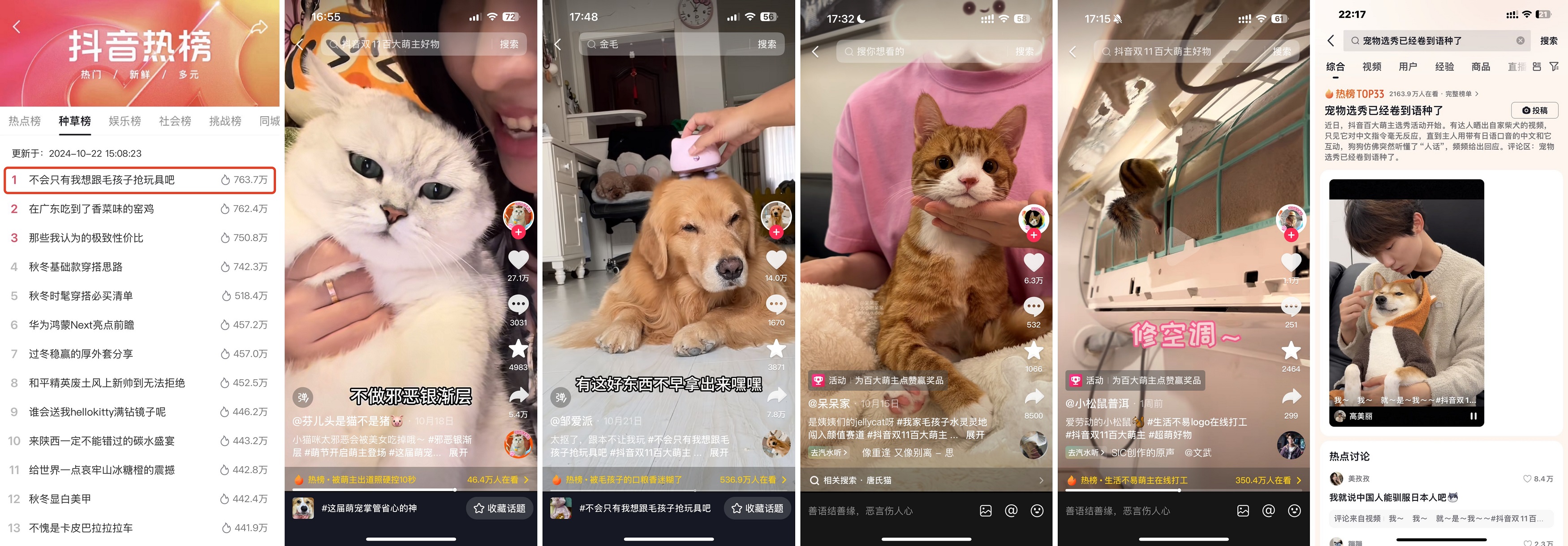 活動期間,抖音電商首次開啟「百大萌主選秀」內容玩法,通過好內容破圈爆發(fā),助力商家收獲新的增長機遇。圍繞德智體美勞五大維度,「百大萌主選秀」攜手眾多萌寵達人展開了一場別開生面的“上才藝”比拼盛宴,全方位挖掘并展現(xiàn)萌寵們的獨特魅力。選秀比拼的花式奇招甚至卷到語種,引發(fā)站內話題#寵物選秀已經卷到語種了 爆火出圈。同時,選秀期間#不會只有我想跟毛孩子搶玩具吧 話題迅速發(fā)酵,登陸抖音種草榜TOP1,#這屆萌寵掌管省心的神 話題播放量超1.6億,憑借高熱度登陸抖音總榜。