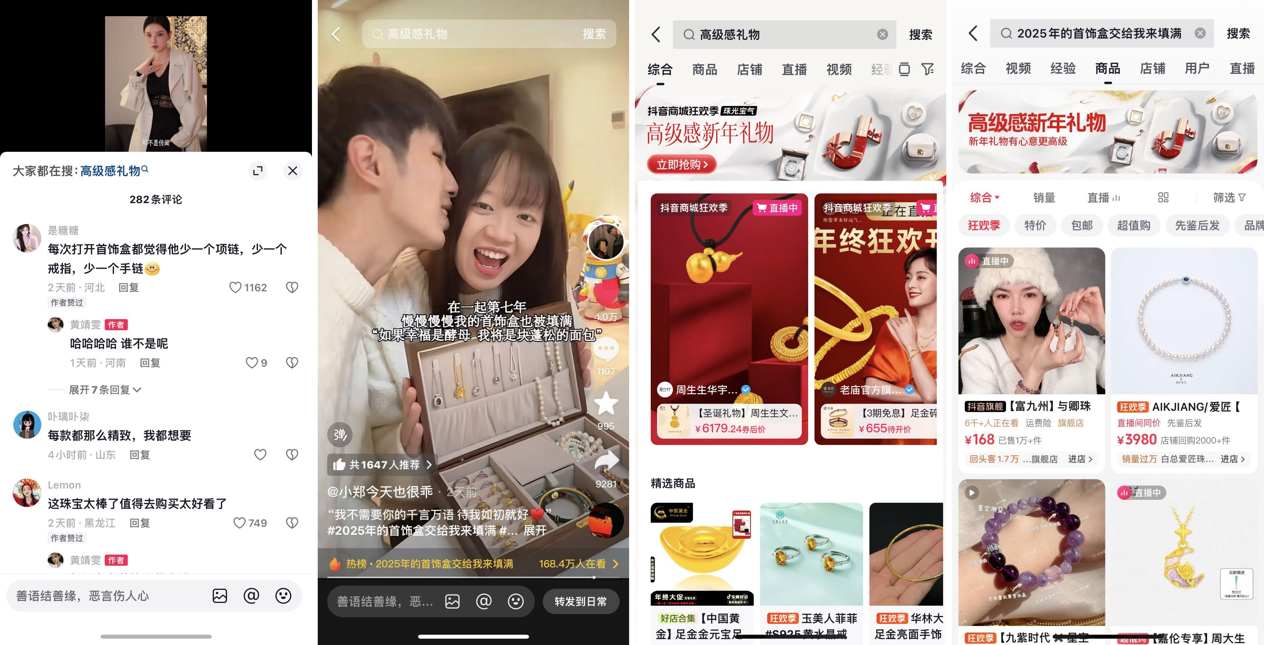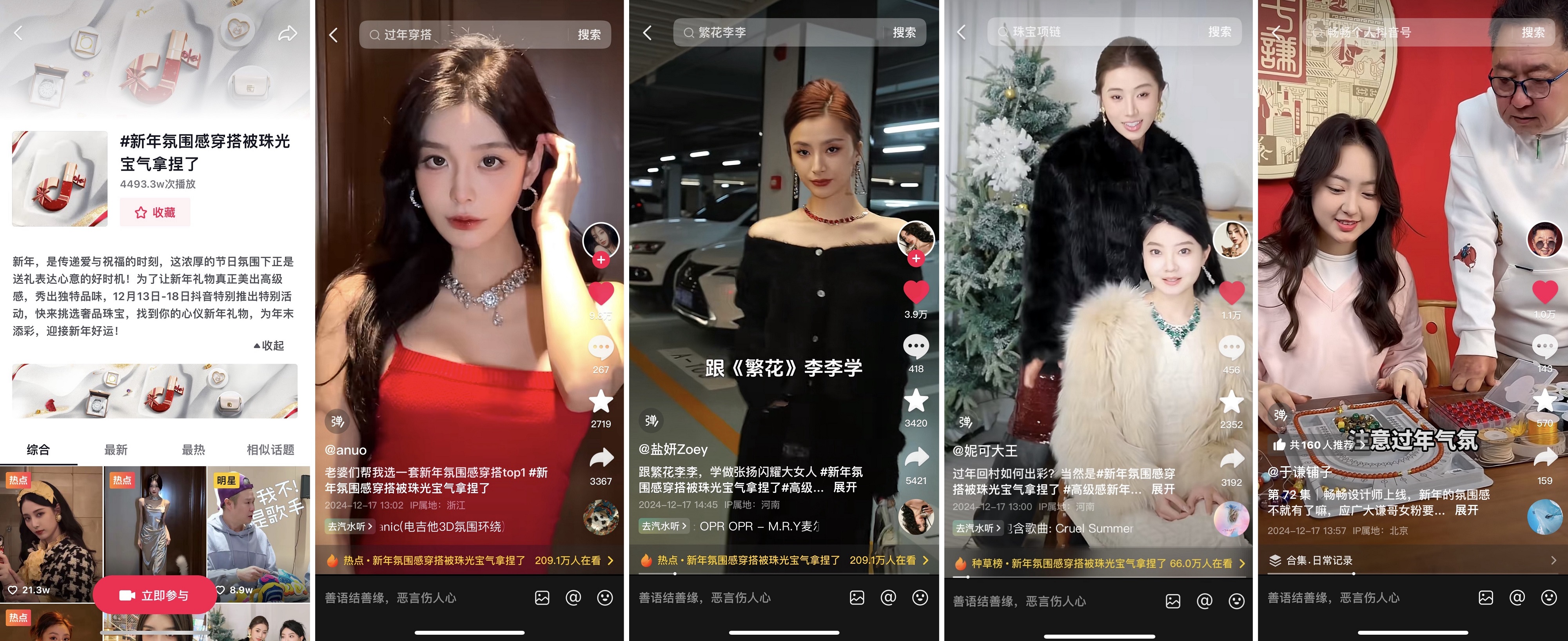 在優(yōu)質(zhì)達(dá)人內(nèi)容的帶動下,#2025年的首飾盒交給我來填滿、#新年氛圍感穿搭被珠光寶氣拿捏了 分別登上抖音種草榜TOP30、抖音種草榜TOP9 ;同時,與話題#高級感禮物 #高級感新年禮物 聯(lián)動多個話題累計(jì)播放量超1億。話題不僅精準(zhǔn)地捕捉到了消費(fèi)者的心理需求,更借助達(dá)人多樣化的敘事,將珠寶潮奢的價值與人們的生活場景、情感體驗(yàn)緊密聯(lián)系在一起,成功為“高級感新年禮物”活動導(dǎo)入更精準(zhǔn)的流量。