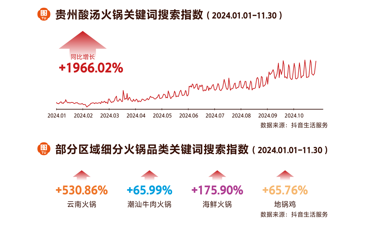 清湯和麻辣口味曾經(jīng)長(zhǎng)期占據(jù)市場(chǎng)主流,隨著消費(fèi)者嘗鮮小眾口味的需求增長(zhǎng),細(xì)分火鍋品類正在崛起。《2024年火鍋行業(yè)消費(fèi)趨勢(shì)報(bào)告》顯示,海鮮火鍋、潮汕火鍋等細(xì)分品類關(guān)鍵詞搜索高漲。其中,貴州酸湯火鍋同比增長(zhǎng)1966.02%,成為今年火鍋市場(chǎng)的“黑馬品類”。這種與地域特色緊密相關(guān)的細(xì)分火鍋品類,激發(fā)著消費(fèi)者“跨區(qū)域”打卡美食的熱情。