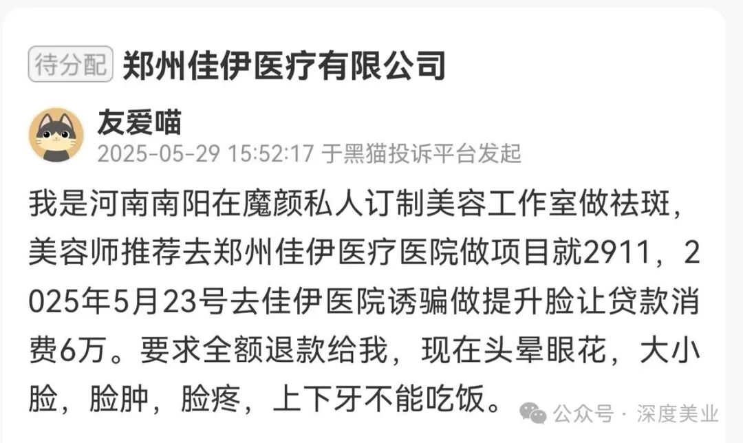 2024年10月30日,還有消費者在黑貓投訴平臺發(fā)起對鄭州佳伊醫(yī)療科技有限公司的投訴。該消費者稱鄭州佳伊醫(yī)療科技有限公司存在不正當(dāng)競爭、利用醫(yī)托渠道、使用非衛(wèi)生技術(shù)人員從事醫(yī)療衛(wèi)生技術(shù)工作、價格未經(jīng)公示、醫(yī)生資質(zhì)存疑、消毒藥品不合格、超說明書使用第三類醫(yī)療器械、手術(shù)注射前未起到實際風(fēng)險告知義務(wù)等問題。