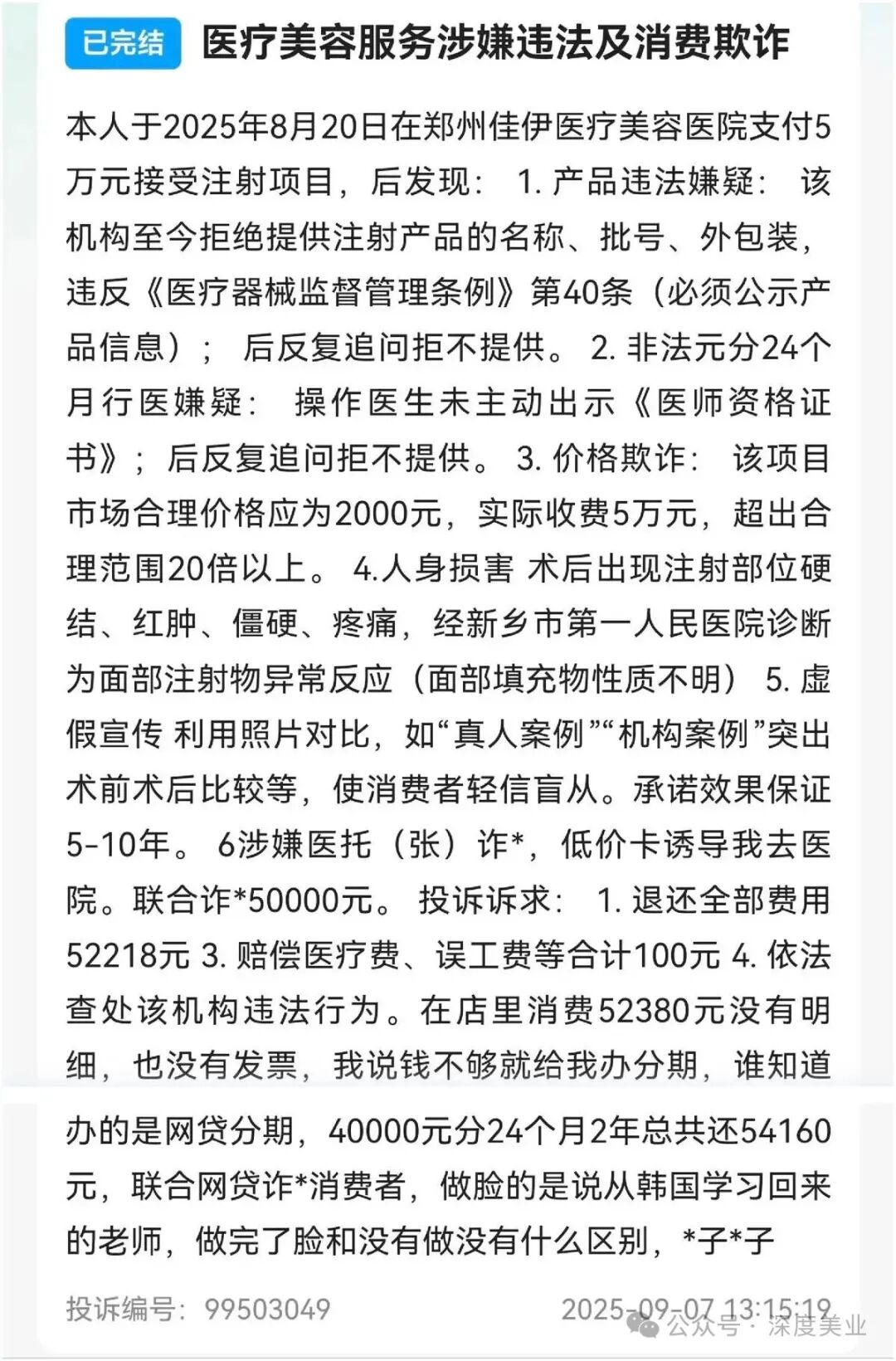 該消費者投訴訴求包括退還全部費用52218元,賠償醫(yī)療費、誤工費等,依法查處該機構(gòu)違法行為。該消費者表示其在該機構(gòu)消費52380元沒有明細,沒有發(fā)票。該消費者錢不夠支付時,工作人員為其辦理了分期,但該消費者并不知道辦的是網(wǎng)貸分期,40000元分期24個月總共還54160元。她認為該機構(gòu)存在聯(lián)合網(wǎng)貸詐騙消費者的情況。截至深度美業(yè)發(fā)稿前,該投訴因未能及時聯(lián)系到該機構(gòu)而被平臺自動關(guān)閉。