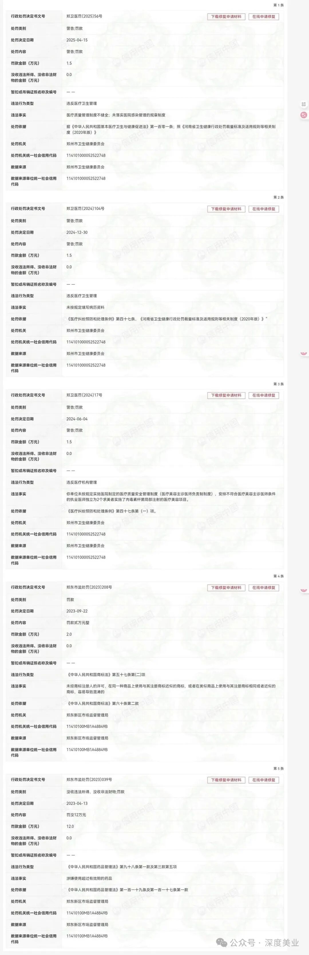 信用中國顯示,鄭州佳伊自2023年起到今年4月,累計受到相關(guān)監(jiān)管部門五次行政處罰。今年4月,還因違反醫(yī)療衛(wèi)生管理相關(guān)規(guī)定,存在醫(yī)療質(zhì)量安全管理制度不健全等原因被罰1.5萬元。其余處罰包括未落實醫(yī)院感染管理的規(guī)章制度、 未按照規(guī)定填寫病歷資料 、 未按規(guī)定實施醫(yī)療質(zhì)量安全管理制度,安排不符合美容主診醫(yī)師條件的執(zhí)業(yè)醫(yī)師獨立為2名患者實施了肉毒素注射面部注射醫(yī)療美容項目。未經(jīng)商標(biāo)注冊人的許可,在同一種商品上使用與其注冊商標(biāo)近似的商標(biāo),或者在類似商品上使用與其注冊商標(biāo)相同或者近似的商標(biāo),容易導(dǎo)致混淆的行為。涉嫌使用超過有效期的藥品??傆嬃P款金額高達18.5萬元。