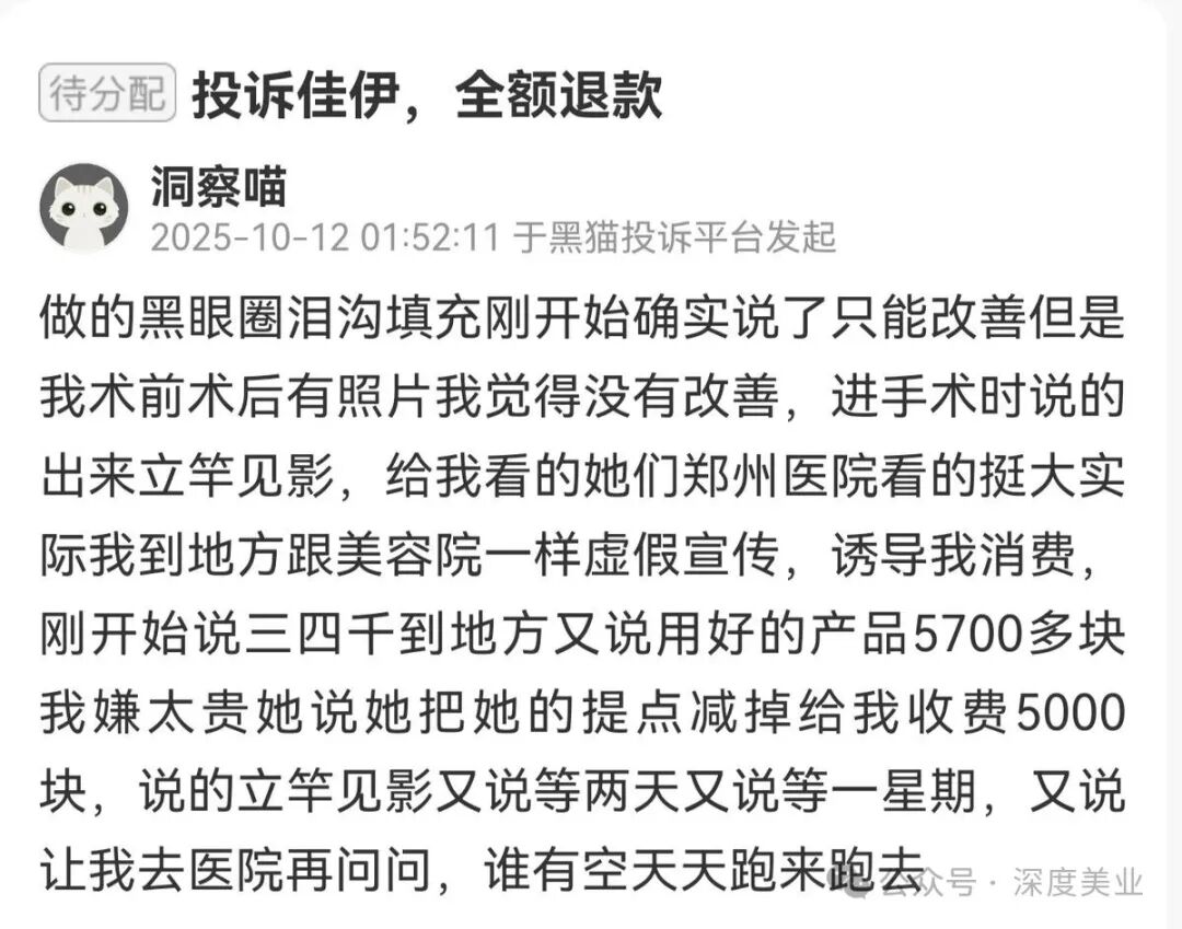 10月12日,一位消費者于黑貓投訴平臺發(fā)起投訴,稱該消費者做了黑眼圈淚溝填充項目,起初該機構(gòu)確實表示只能改善,該消費者留存了術(shù)前術(shù)后照片,認為術(shù)后結(jié)果未實現(xiàn)改善效果。該消費者表示,進入手術(shù)環(huán)節(jié)時,該機構(gòu)稱術(shù)后效果立竿見影,還向該消費者展示機構(gòu)的相關(guān)照片。該消費者提到,照片里看起來規(guī)模較大,實際該消費者到店后發(fā)現(xiàn)此處與美容院無異,存在虛假宣傳、誘導(dǎo)該消費者消費的情況。