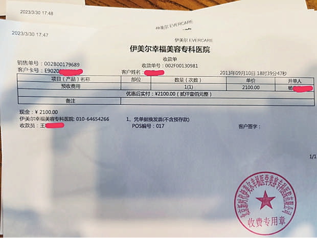 王女士在“伊美爾幸福”進(jìn)行醫(yī)美消費(fèi)長(zhǎng)達(dá)10年之久,因兩次手術(shù)遇到的問(wèn)題,讓她對(duì)以往做過(guò)的醫(yī)美項(xiàng)目、醫(yī)療服務(wù)以及使用的器械、藥品、產(chǎn)品是否合規(guī)合法產(chǎn)生疑問(wèn)。于是,王女士提出打印既往消費(fèi)項(xiàng)目及產(chǎn)品明細(xì)。令她沒(méi)想到的是,在“伊美爾幸福”提供的收款單上,很多項(xiàng)目及產(chǎn)品名稱均顯示為“預(yù)收費(fèi)用”,而不是具體的項(xiàng)目名稱或產(chǎn)品明細(xì)。記者在王女士提供的一份收款單上看到,項(xiàng)目名稱一欄明確標(biāo)明了用于面頰填充的透明質(zhì)酸鈉填充產(chǎn)品“喬雅登豐顏”,數(shù)量顯示為3,實(shí)付金額31265元。但在另一份收款單上,項(xiàng)目名稱一欄僅顯示“預(yù)收費(fèi)用”,數(shù)量顯示為1,實(shí)付金額2100元。