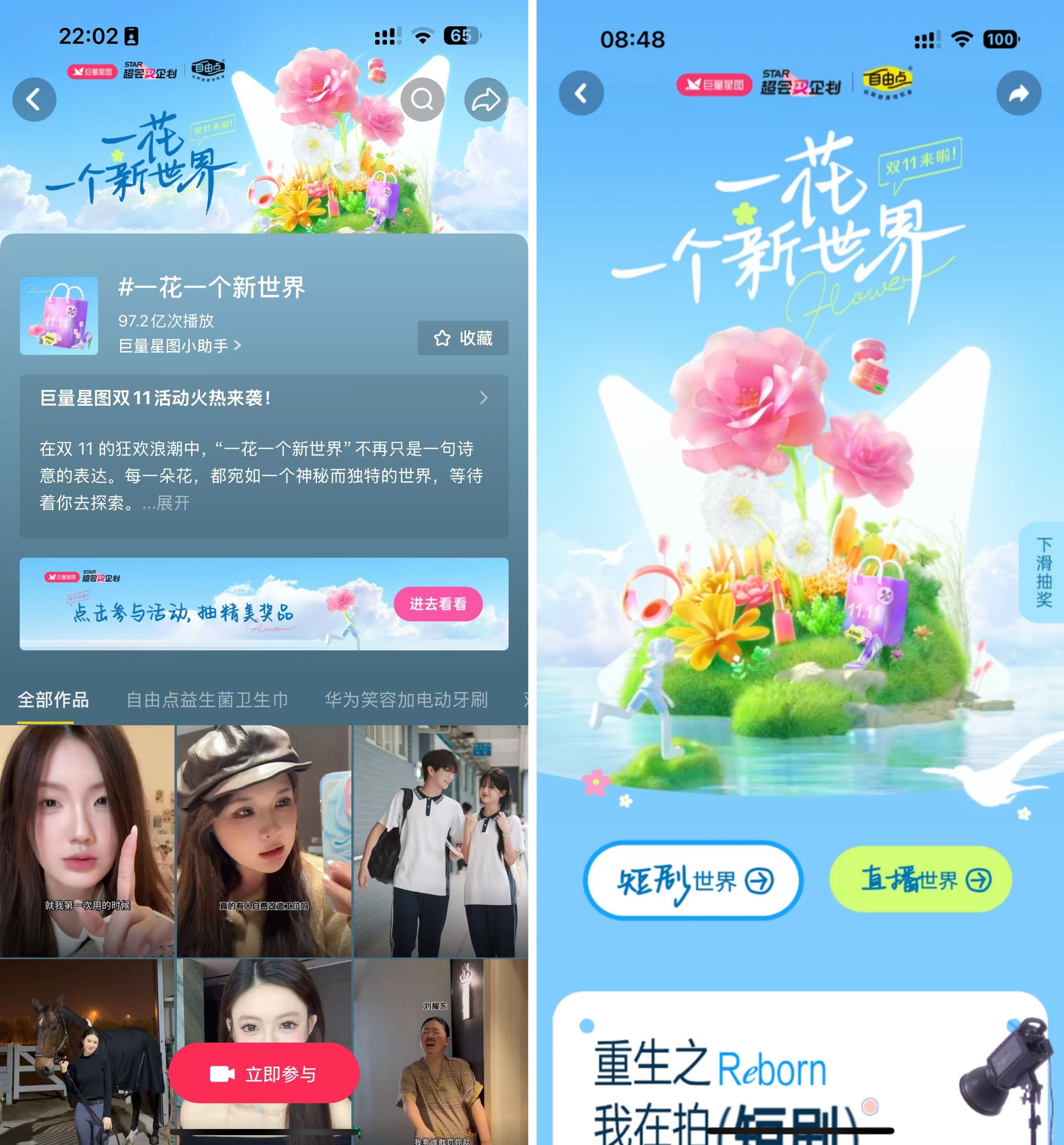 成功打造了主話題#一花一個新世界,實現(xiàn)90億+全網(wǎng)曝光量,5.5W+UGC參與,442家品牌聯(lián)動,1000+達人攜手,12.5%的流量激勵幅度,子話題 #雙11超會買 #奇趣時刻歡樂多 #短劇界的金花賞,掀起 7億+關(guān)注熱潮……