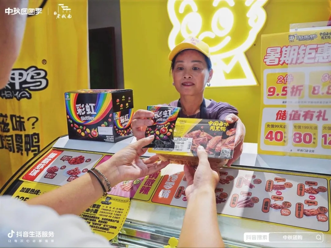 這次,在抖音生活服務(wù)「中秋團(tuán)圓季」,彩虹糖與周黑鴨組成CP,推出“熱辣甜心,爽爆神經(jīng)”的組合新品,帶來(lái)甜辣兼?zhèn)涞莫?dú)特味蕾記憶。乘勢(shì)中秋大促,聯(lián)名套餐上架至活動(dòng)的團(tuán)購(gòu)頁(yè)面,在平臺(tái)公共流量的助力下,用戶在購(gòu)買(mǎi)中秋應(yīng)季貨品的同時(shí),也被這款玩趣“食”足的跨界新品吸引,“邊看邊買(mǎi)”自然帶動(dòng)彩虹糖和周黑鴨的雙贏轉(zhuǎn)化成績(jī),達(dá)成“1+1>2”的種草效果。
