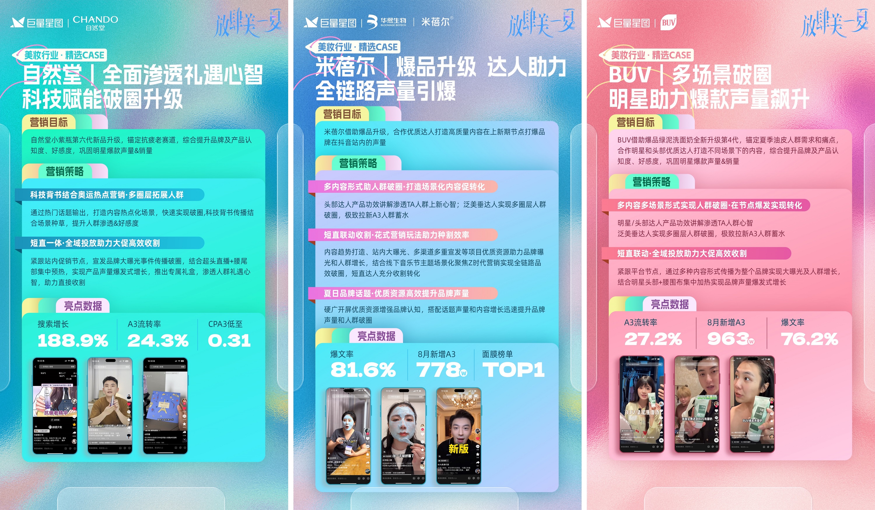 四季更迭,肌膚隨之變化。春天敏感脆弱、夏季高溫出油、秋季皮膚不適,冬季干裂凍傷。品牌方要如何在市場(chǎng)競(jìng)爭(zhēng)中精準(zhǔn)捕捉機(jī)遇,突破營(yíng)銷增長(zhǎng)瓶頸?巨量星圖美妝Star顏究院「女生們的暑假」第三季#放肆美一夏 活動(dòng)給出了答案。巨量星圖通過(guò)精準(zhǔn)洞察消費(fèi)者需求,巧妙布局護(hù)膚與彩妝雙賽道,不僅成功吸引了大量消費(fèi)者的關(guān)注與參與,更在營(yíng)銷效益與品牌價(jià)值雙維度上成績(jī)斐然。