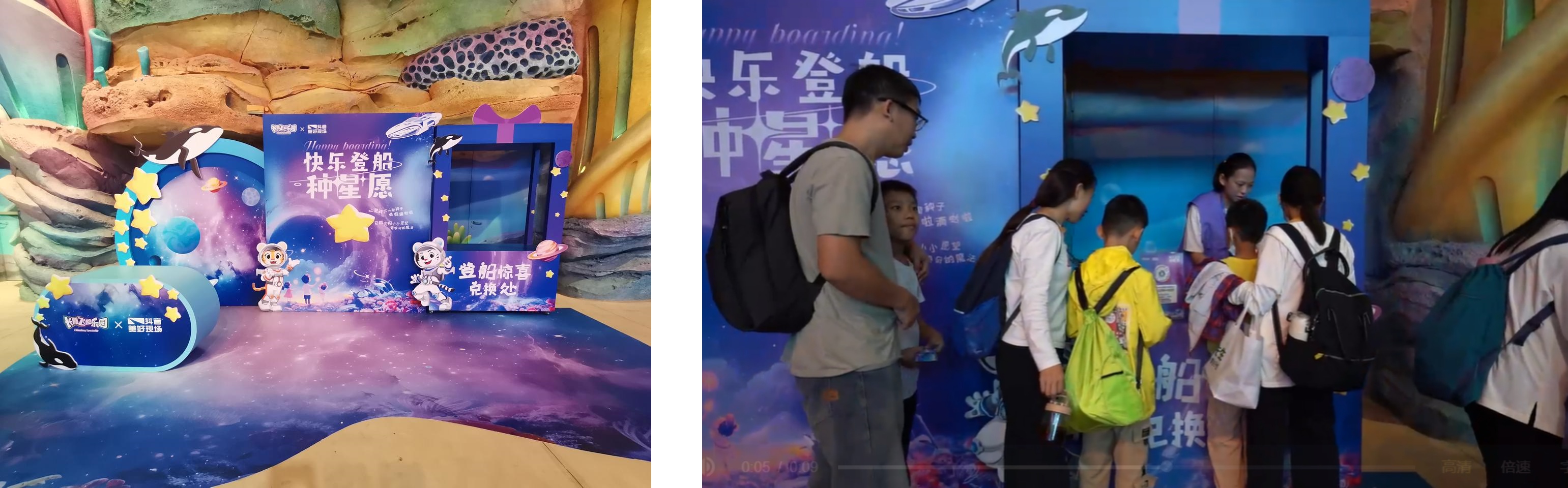 緊接著,這群小探險(xiǎn)家們滿懷憧憬的來(lái)到了長(zhǎng)隆飛船樂(lè)園二樓的「虎鯨科普劇場(chǎng)」,那里正上演著一場(chǎng)讓人目不暇接的虎鯨行為展示,孩子們仿佛置身于夢(mèng)幻的水下世界,感受虎鯨的魅力,他們興奮地舉著小手,與保育員積極互動(dòng),這場(chǎng)表演不僅讓他們大飽眼福,更在他們心中悄悄打開了一扇學(xué)習(xí)海洋生物知識(shí)的大門,埋下了一顆對(duì)海洋無(wú)限向往的種子。而活動(dòng)的高潮部分,無(wú)疑是在長(zhǎng)隆飛船樂(lè)園二樓的星愿墻前,5名幸運(yùn)的星玩家有幸為星星命名,他們滿懷儀式感地點(diǎn)亮了屬于自己的星星,并與其合影留念,將這份特別的美好瞬間封存起來(lái)。
