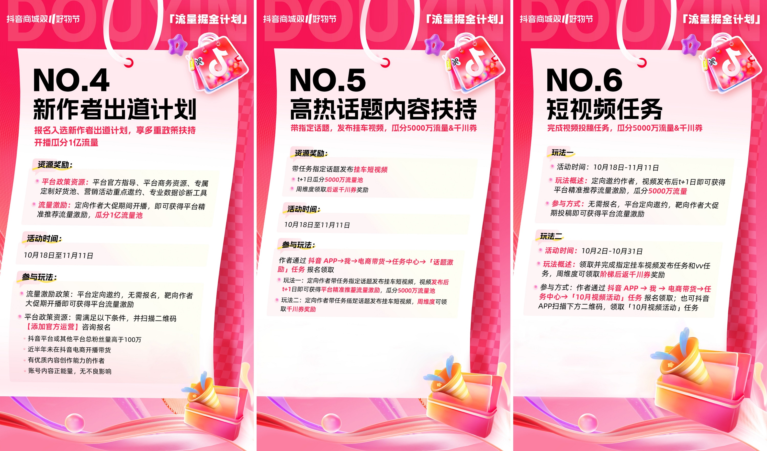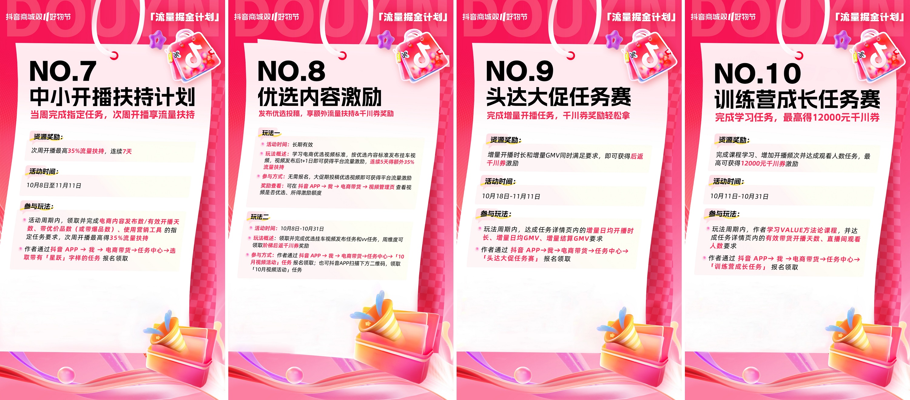 • 10月18日至11月11日期間,作者完成視頻投稿任務(wù),即可瓜分5000萬(wàn)流量。10月2日至10月31日期間,作者領(lǐng)取并完成指定掛車視頻發(fā)布任務(wù),每周贏千川券獎(jiǎng)勵(lì)。