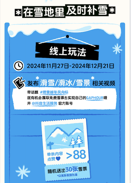 此外,活動周期內(nèi)(11月27日至12月21日),只要你在抖音發(fā)布與雪場打卡、滑雪、滑冰或者雪景相關(guān)的視頻,并且?guī)匣顒釉掝} #燃雪越冬風(fēng)向標(biāo),就有機(jī)會贏取免費(fèi)雪票。